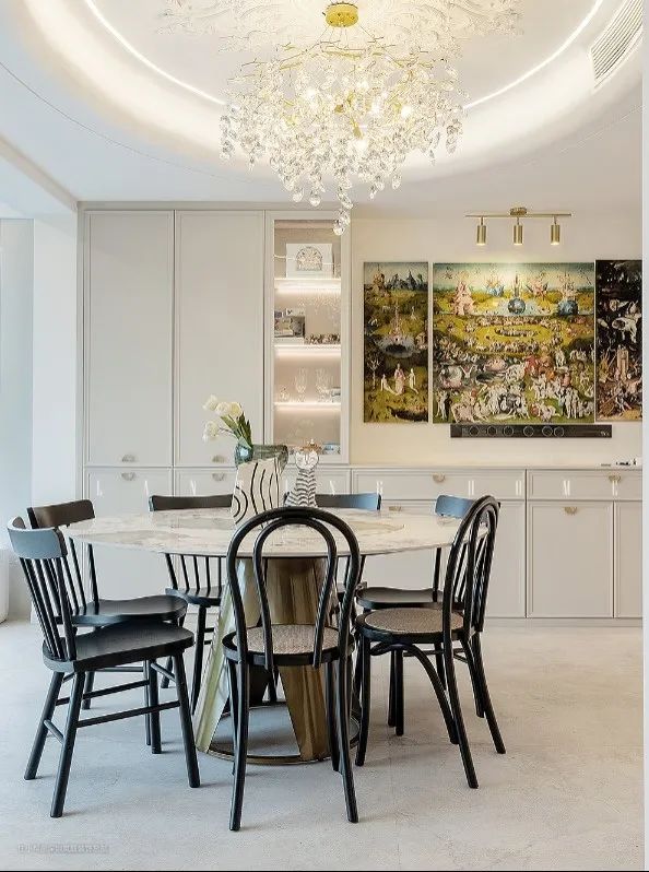 餐厅选择圆顶造型,精致奢华的水晶吊灯搭配石膏灯盘,展露空间高级感。