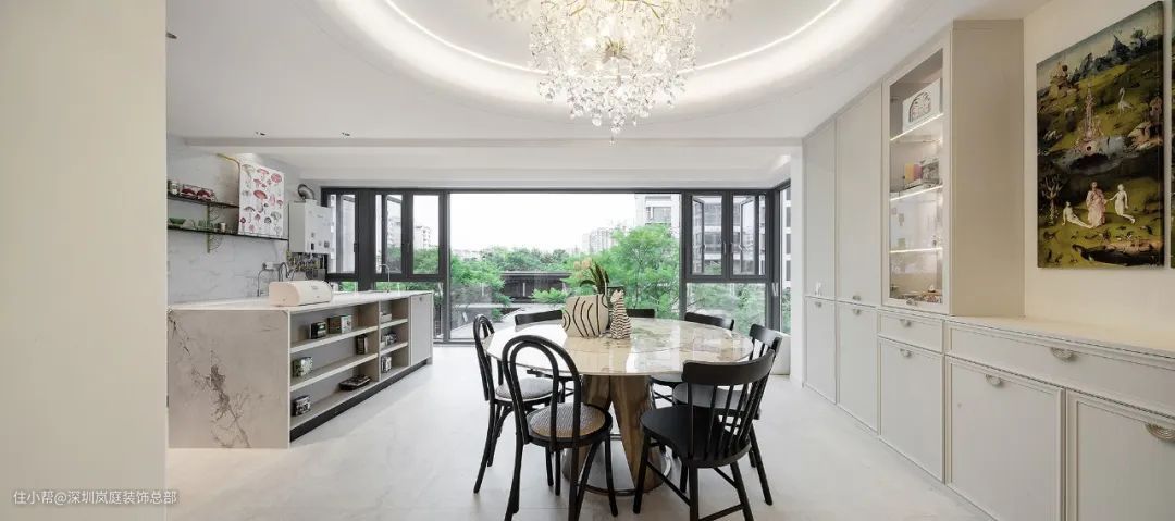 开放式餐厨空间,设计师利用三分法合理分配操作区、收纳区、用餐区,结合大落地窗注入的风景和光线,给予居住者更舒适愉快的居住体验。