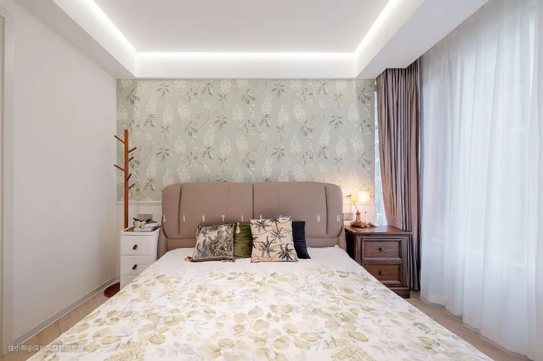 老人房的空间不大,但是温馨实用是第一位的,卧室背景墙采用同样的设计手法,网红栗子树壁布不张扬也不平凡,符合老人的喜好。