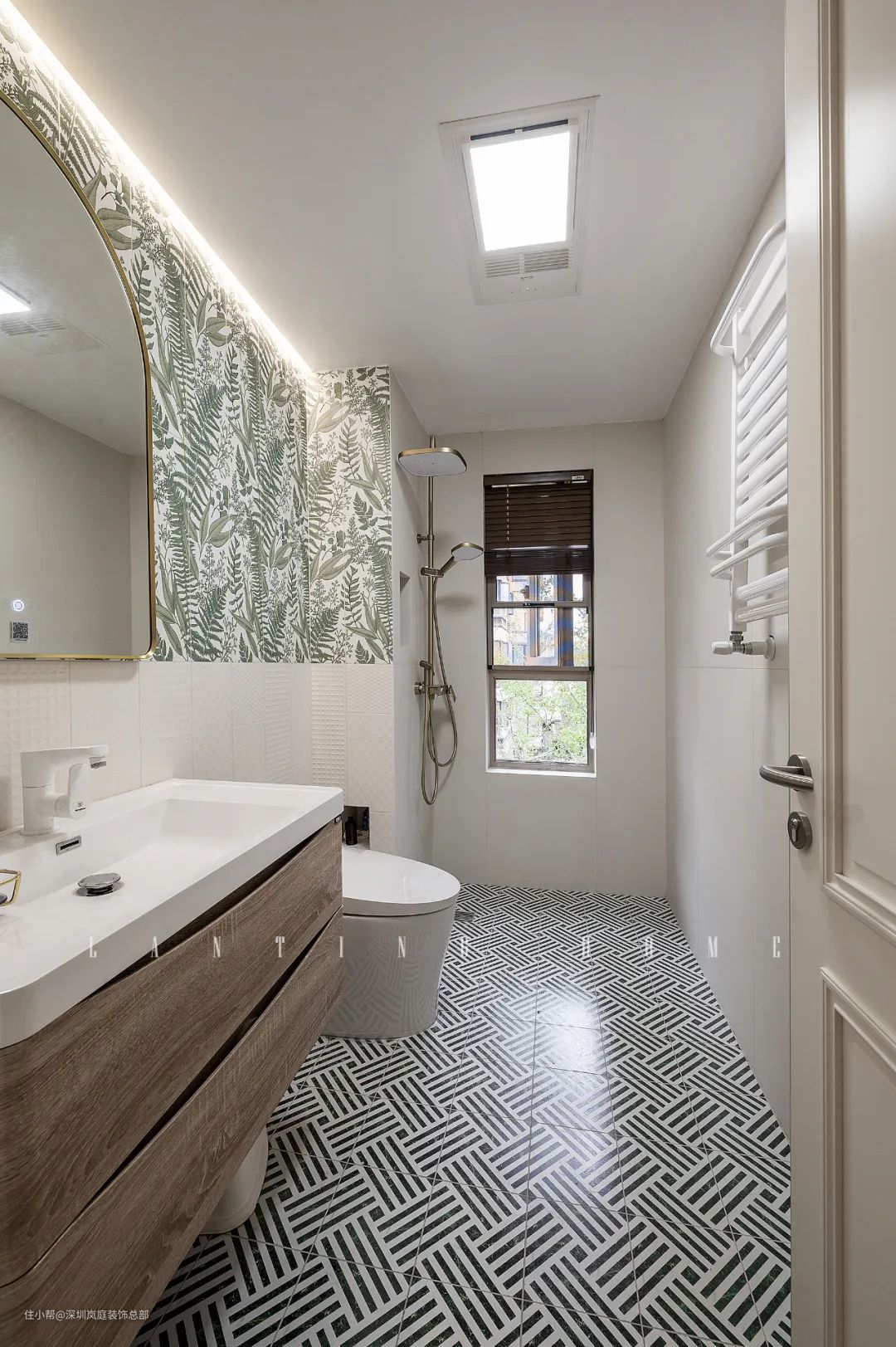 次卫的格局是长方形的,直接一字排开,合理划分空间功能区,墙面选择750*1500的墙砖铺贴,更能彰显大气的效果。在马桶区域的墙砖选择绿色的花砖铺贴,在视觉上彰显清新感,成为空间中的一抹亮色调,平衡空间配色比例。