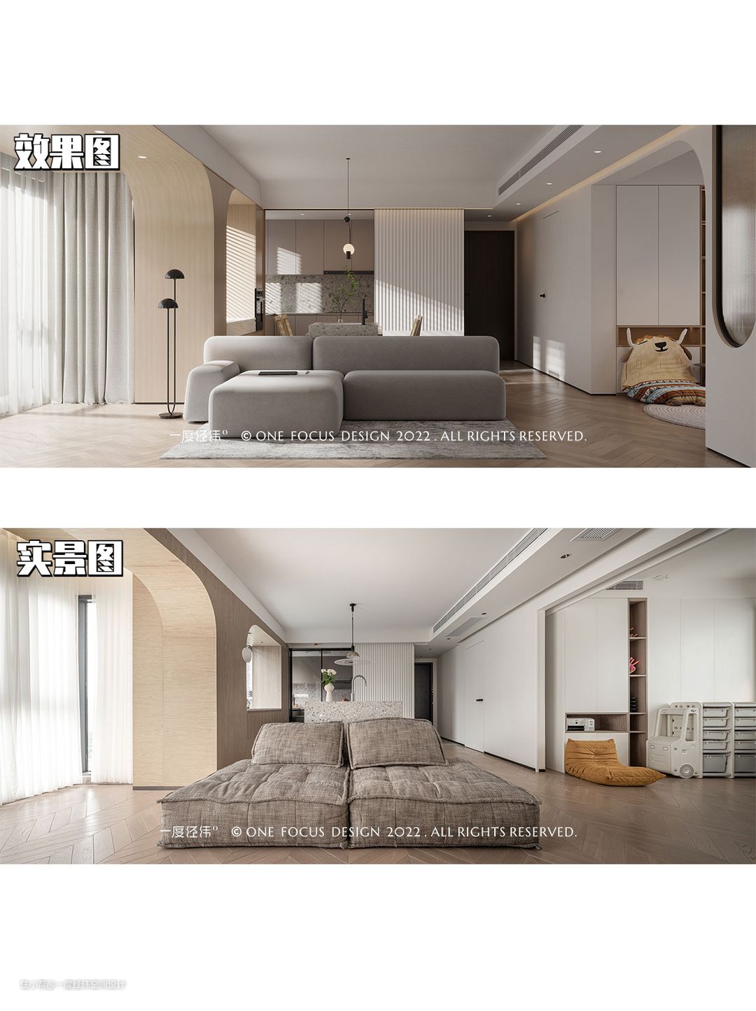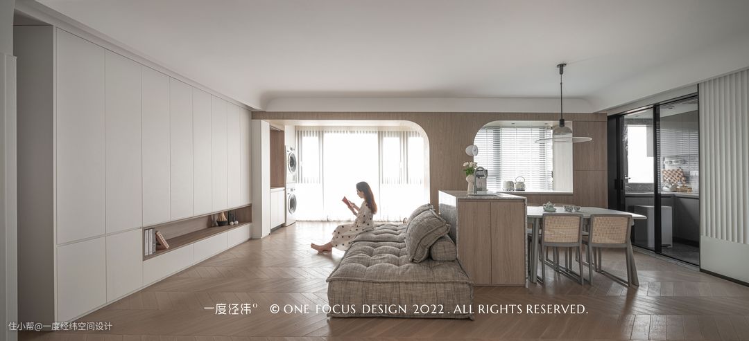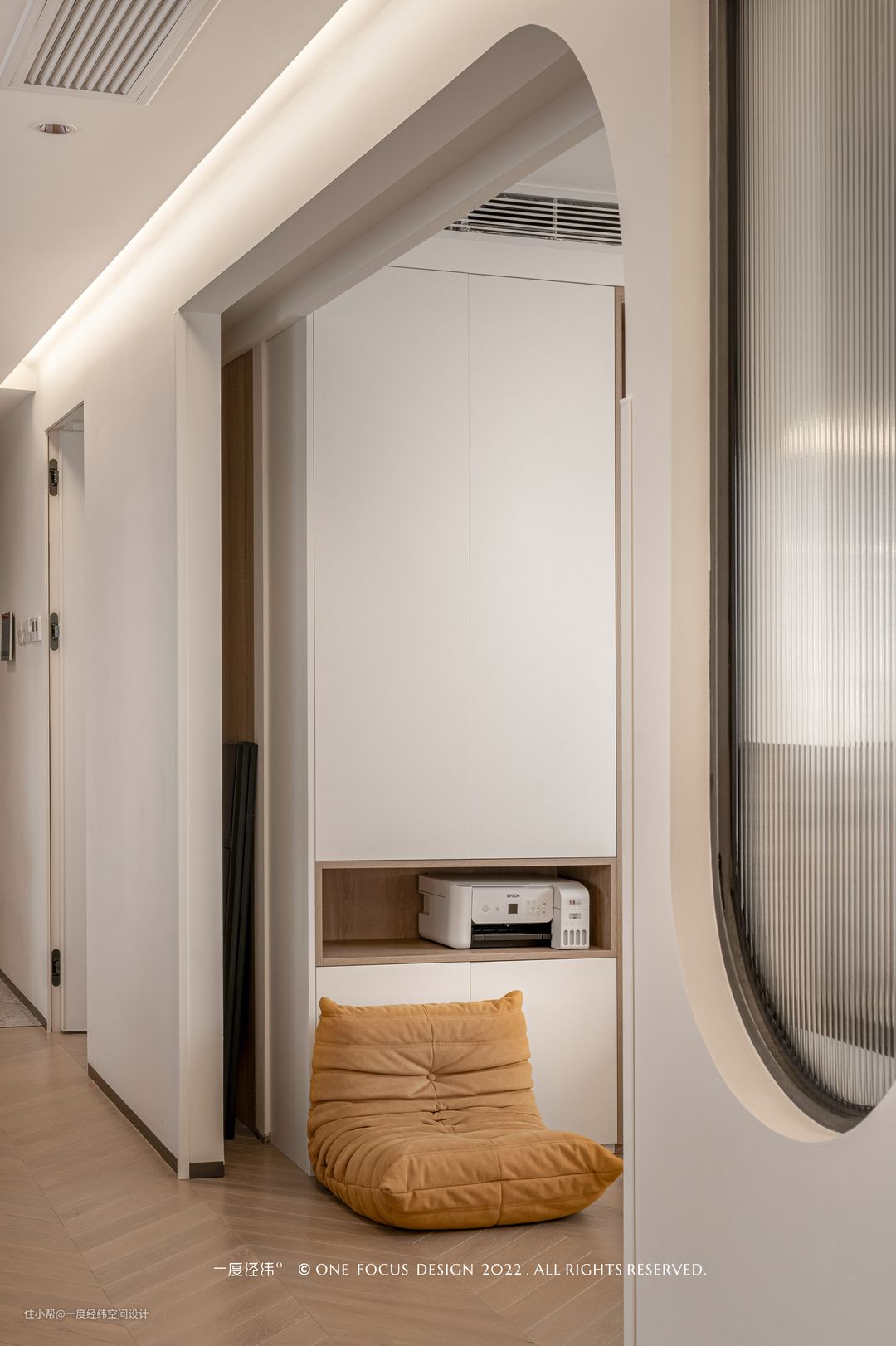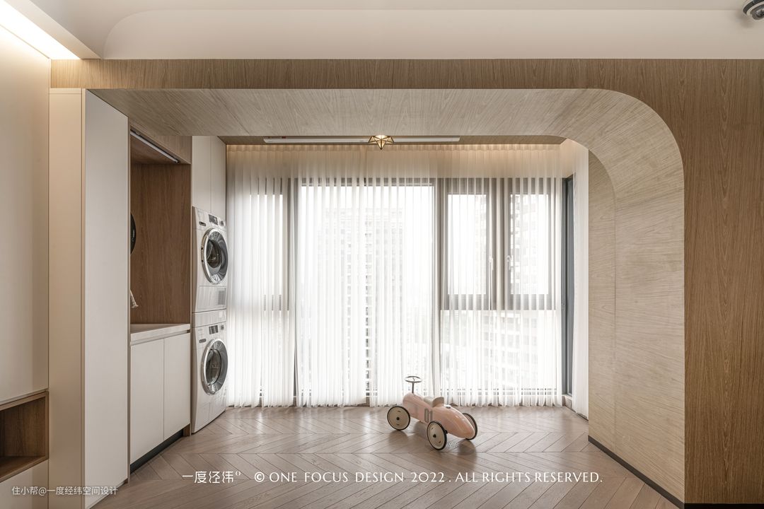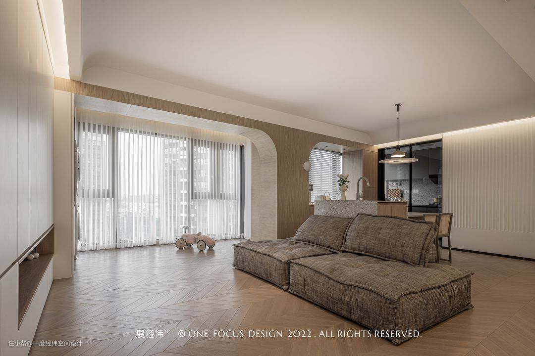 本案是一个二手房改造的项目,整体呈现现代简约风格。因为平时是女主人和孩子居住为主,设计上采用自然色调的木纹和大面积留白处理,做了亲子互动区域与大量的收纳空间。 客餐厅区域在部分墙体和天花的交界处采用了圆弧的形式去连接,呼应天花的圆弧造型。视野通透明亮,开放无拘的格局,摒弃繁杂的装饰,清新明亮。