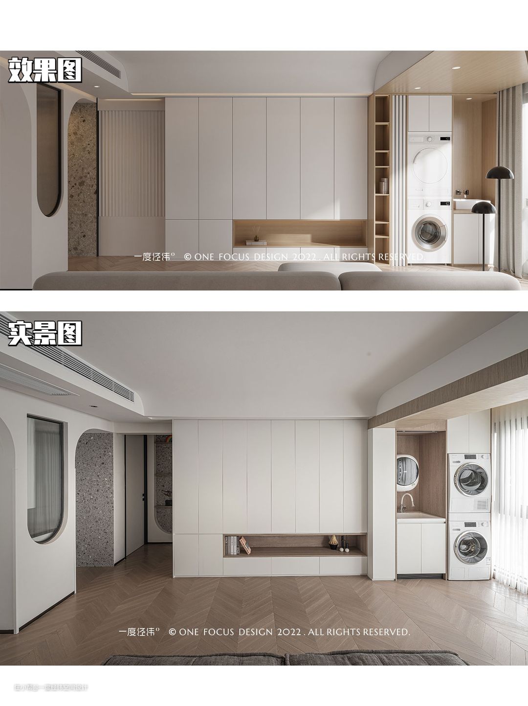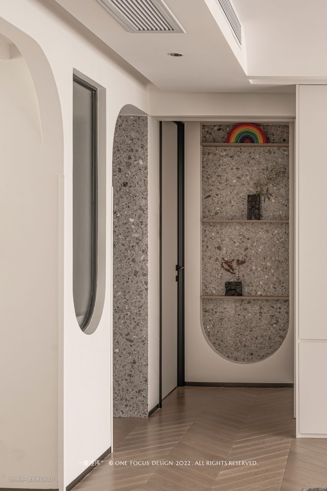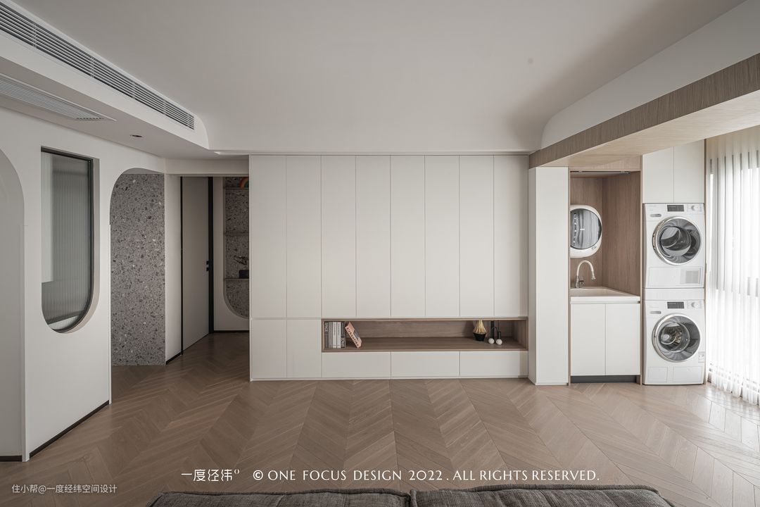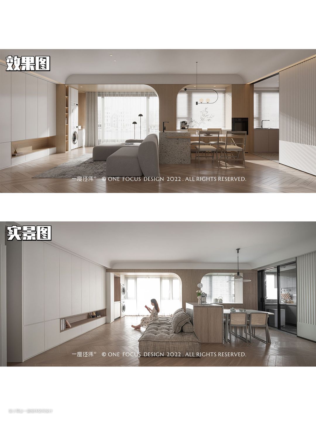 本案是一个二手房改造的项目,整体呈现现代简约风格。因为平时是女主人和孩子居住为主,设计上采用自然色调的木纹和大面积留白处理,做了亲子互动区域与大量的收纳空间。 客餐厅区域在部分墙体和天花的交界处采用了圆弧的形式去连接,呼应天花的圆弧造型。视野通透明亮,开放无拘的格局,摒弃繁杂的装饰,清新明亮。