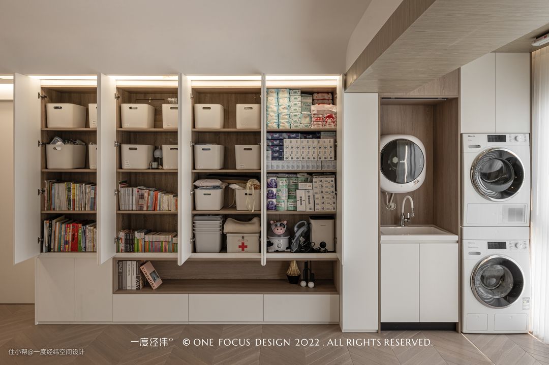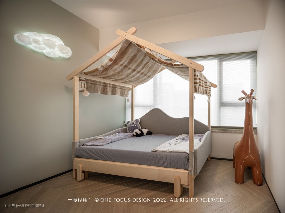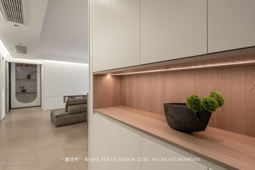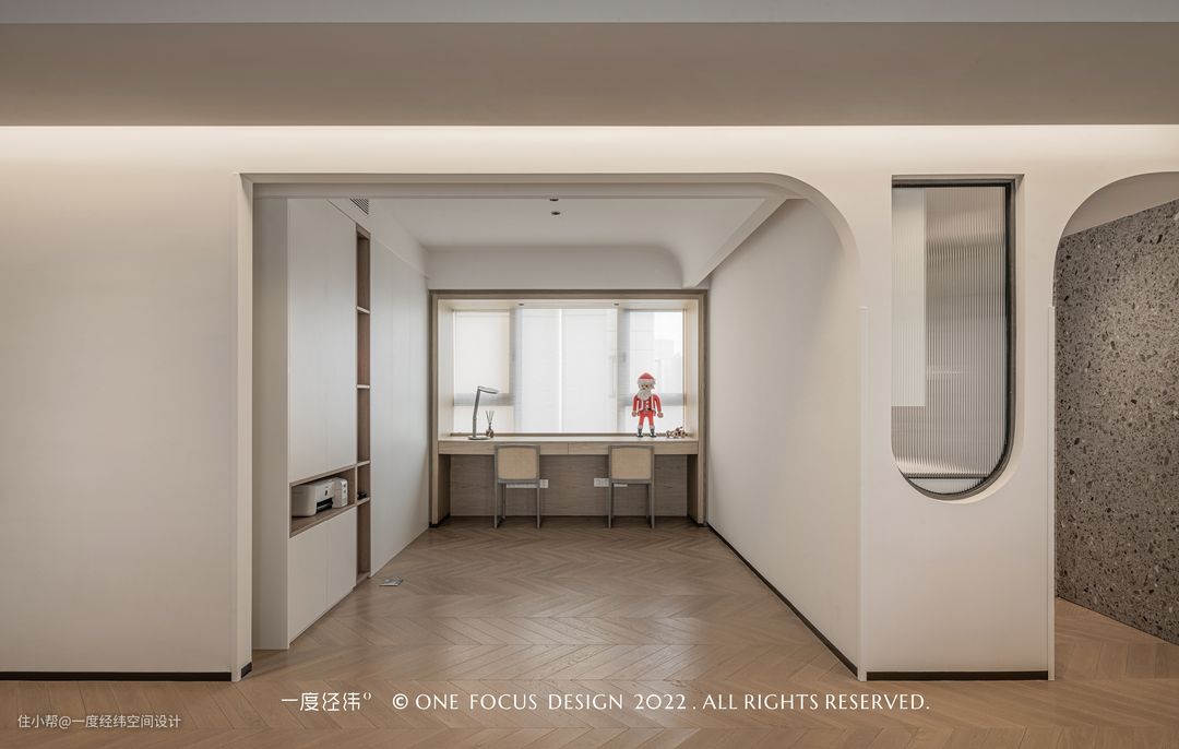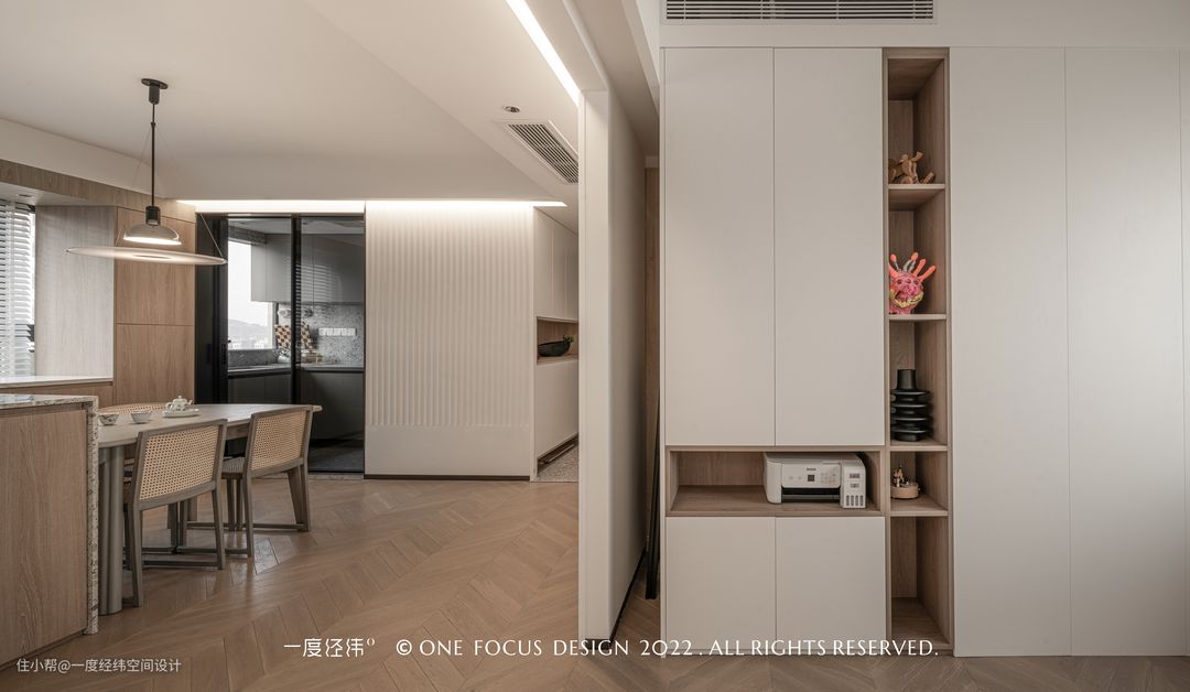 整体呈现现代简约风格。因为平时是女主人和孩子居住为主,设计上采用自然色调的木纹和大面积留白处理,做了亲子阅读互动区域与大量的收纳空间。