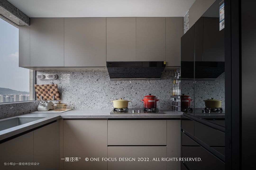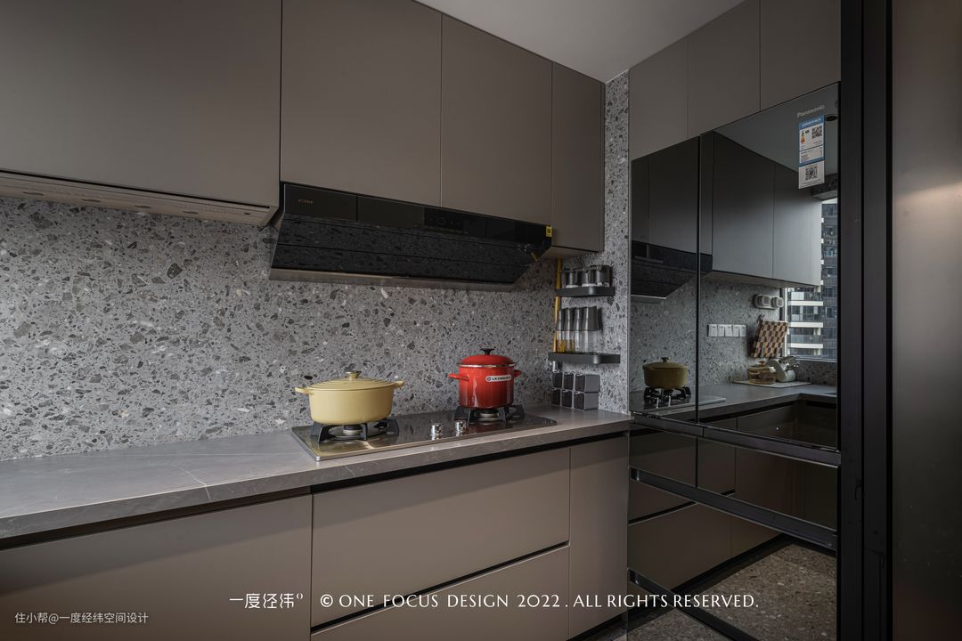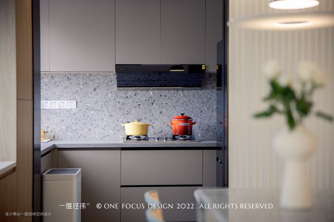 墙面铺贴800*800水磨石砖,吊柜下方设置隐藏灯带,方便于厨房切菜操作,打开玻璃槅门不仅可以隔绝油烟也可以让厨房空间变得更加宽阔。