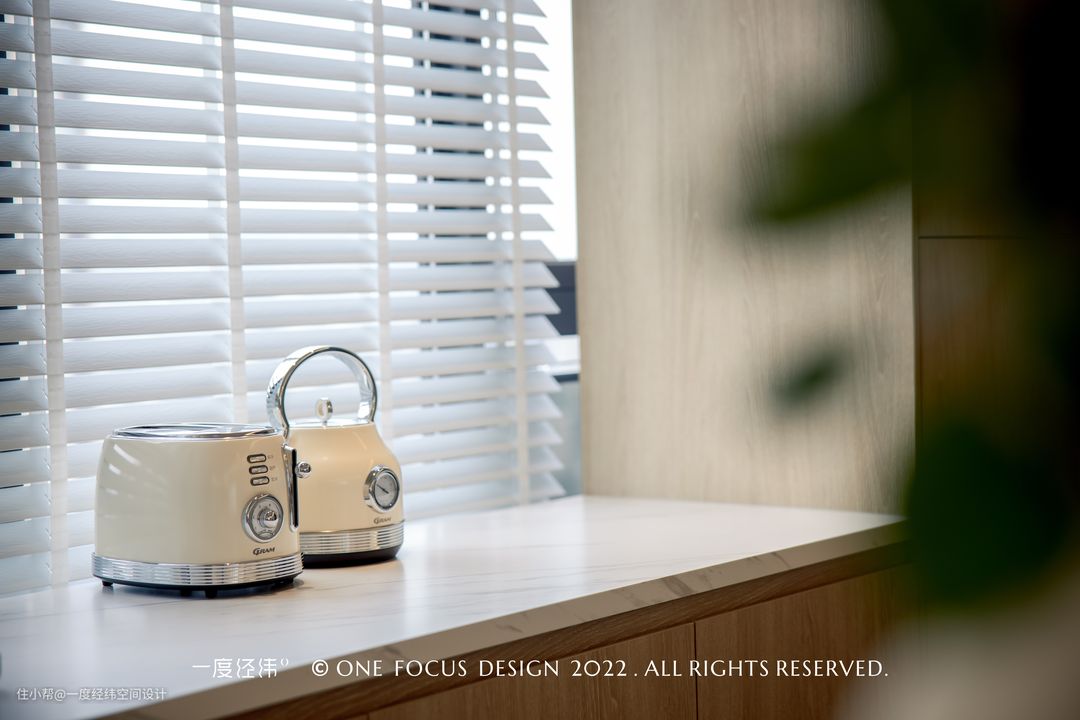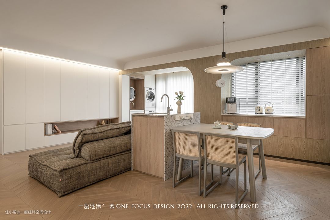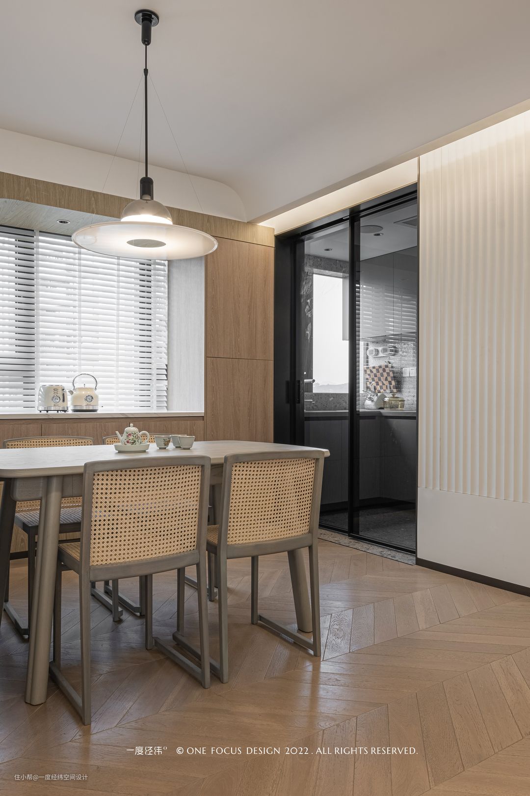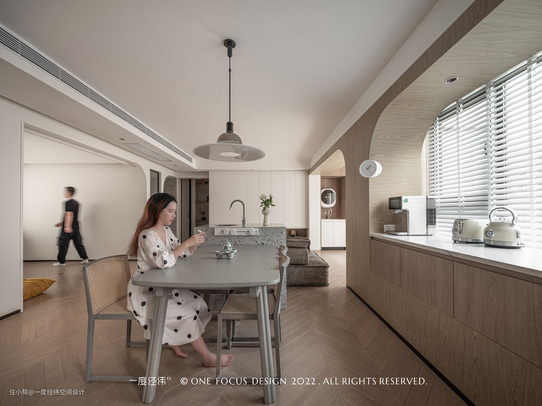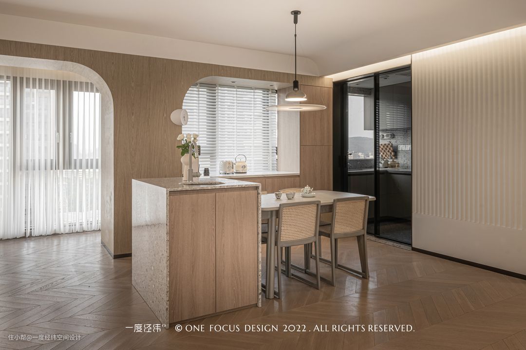 餐厅区域利用飘窗打造西厨,用于解决简餐需求以及收纳电器功能,餐厅区域放置岛台与餐桌。