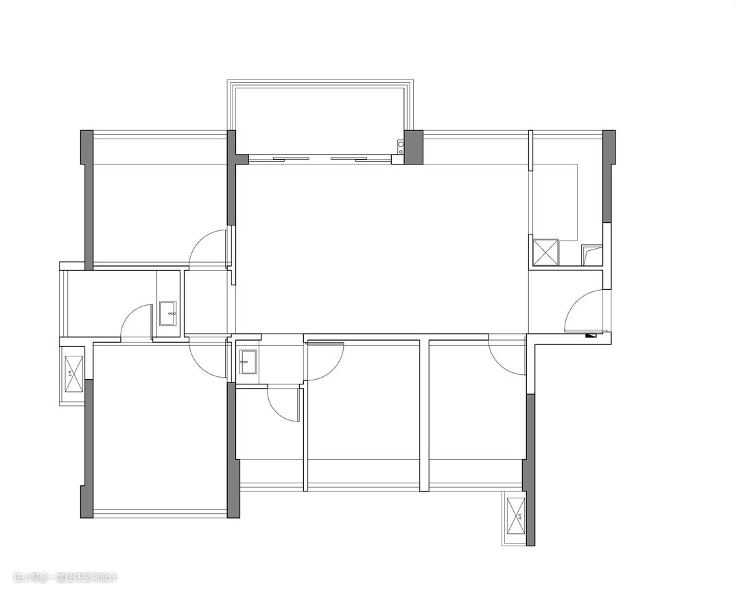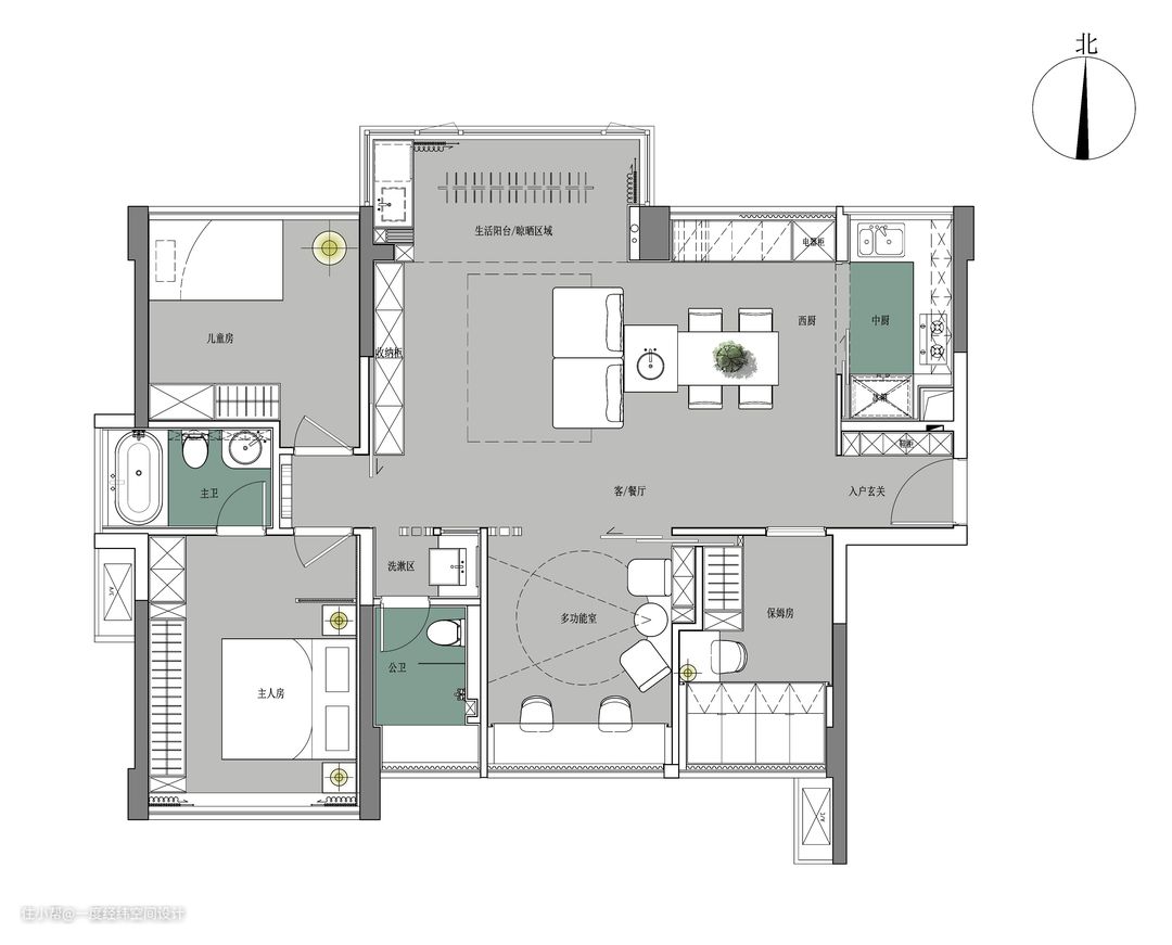 ①餐厅区域利用飘窗打造西厨,用于解决简餐需求以及收纳电器功能。中厨增设储物空间,通过玻璃移门隔断,既可关上成为独立成为一间厨房也可打开扩张外部西厨的空间。 ②客厅做无电视设计,背景墙做成收纳柜,放置日常物品。原生活阳台的推拉门拆除,阳台封窗与墙体打通形成开放休闲区域,让客餐厅区域更加视野通透明亮。 ③把公卫旁的卧室更改门的方向做成开放的多功能房,形成亲子互动区域且与客餐厅空间形成对流;公卫洗手台更改方向,运用墙面弧形造型遮挡,同时也增加空间趣味性。 ④多功能房与保姆间的墙体改造成Z字形墙体,分别供于多功能房与保姆房区域空间收纳的同时留下最大的空间给到衣柜、书桌等活动区域。