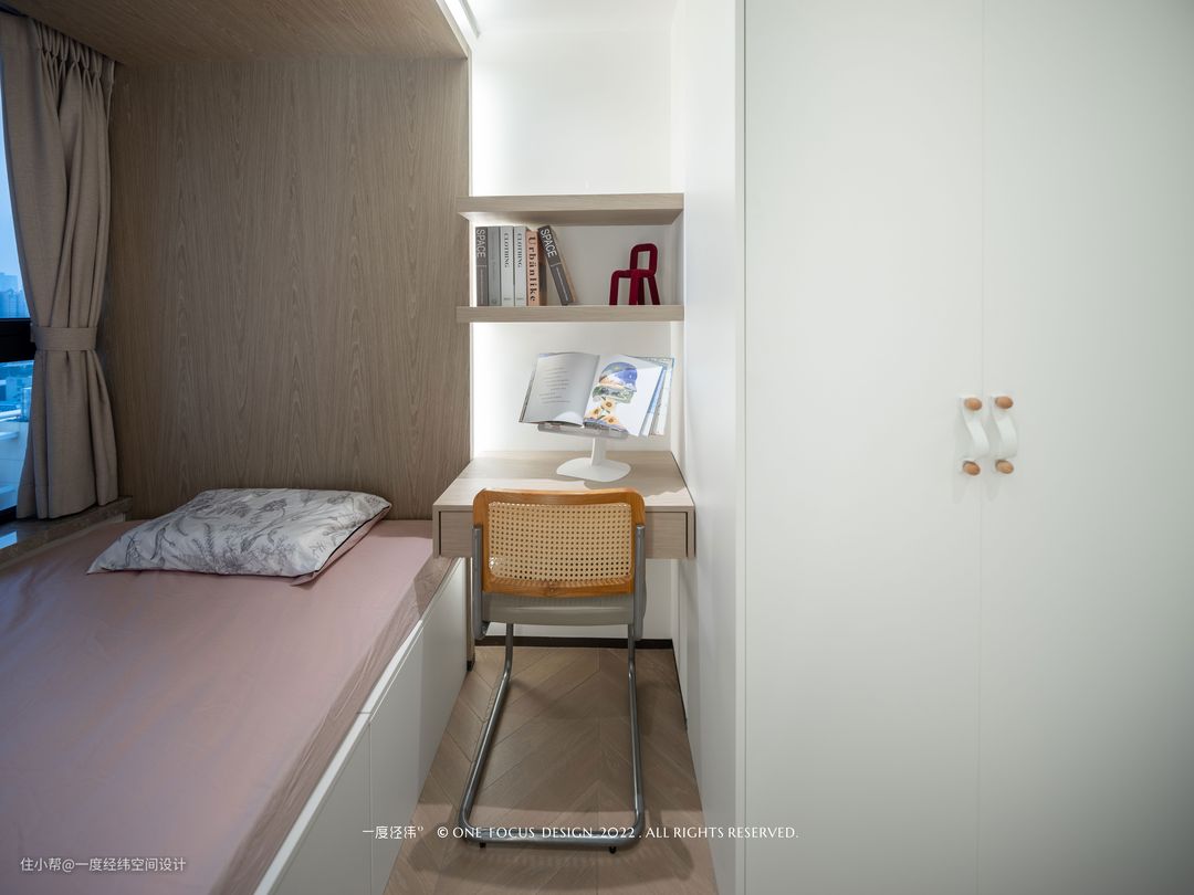 由于空间格局相对局促,设计师把多功能房做成一个孩子看书,一家人观影的区域。闲暇时光,阅读玩耍、制作手工,乐享亲子互动时光。今后也可以改为儿童房使用。