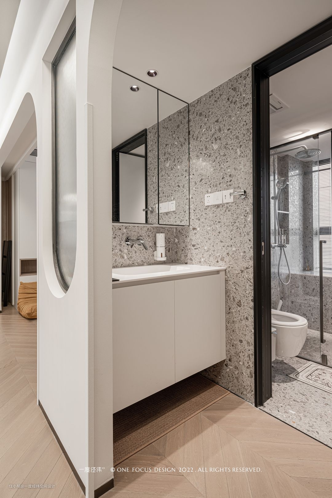 洗手盆更换了位置更显的空间宽敞,用弧形墙面遮挡生活中的尴尬。用木地板与水磨石分区,干区湿区用地板颜色做好区分。