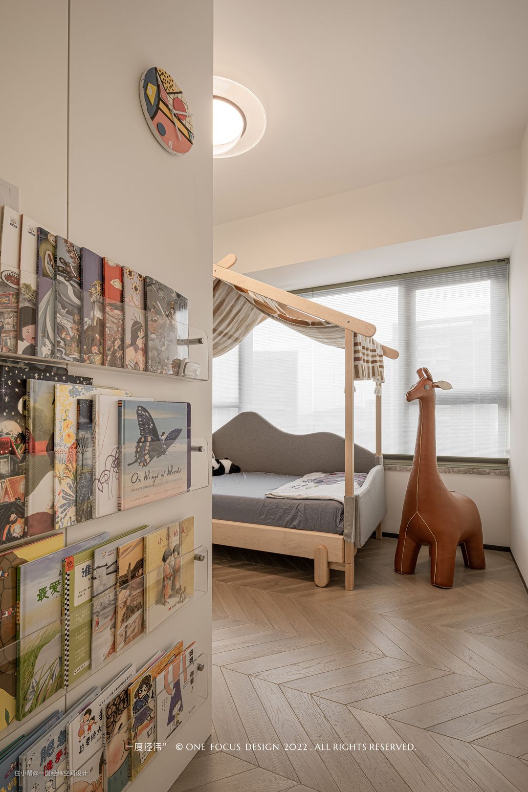 儿童房以青、白色和木色为主,进门墙面整齐放置了儿童绘本读物,为孩子营造一个良好的阅读居住空间。