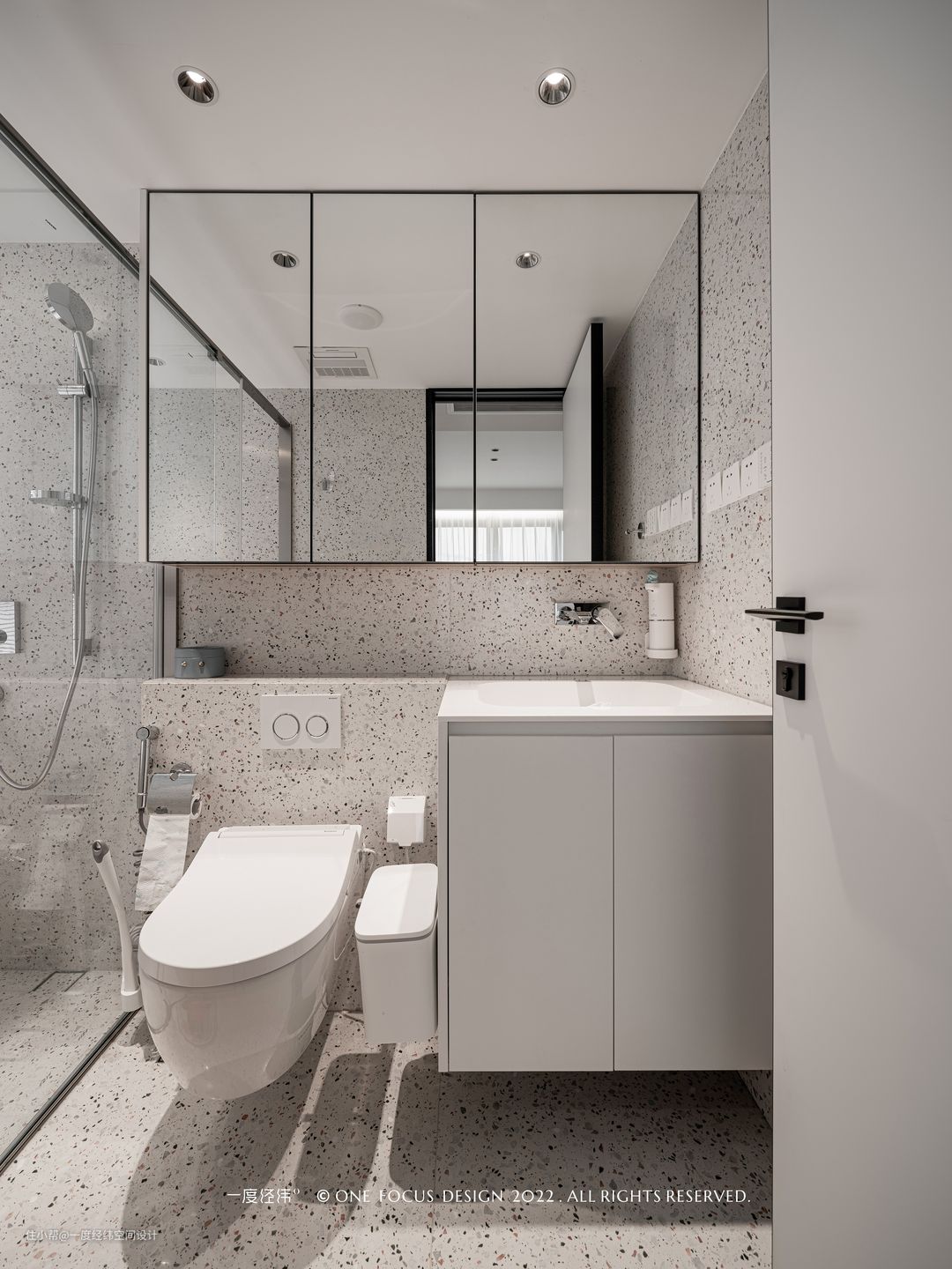 地面墙面铺贴水磨石砖,环境清新淡雅,墙上的镜面柜的镜面更加拉伸了空间感,让空间显得更加宽阔。