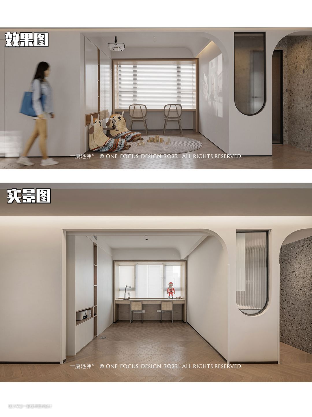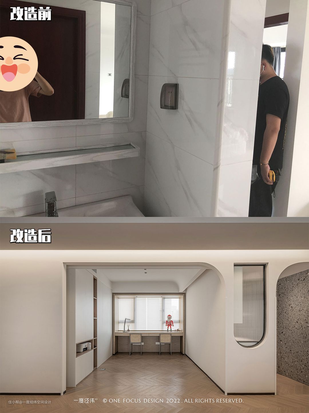 由于该房子是家庭居住,把其中一间卧室改造成开放式多功能房给孩子的玩耍阅读空间,避免一开门就是洗手盘的尴尬,洗手盘也更换了方向用弧形造型遮挡,美观舒适且空间通透。