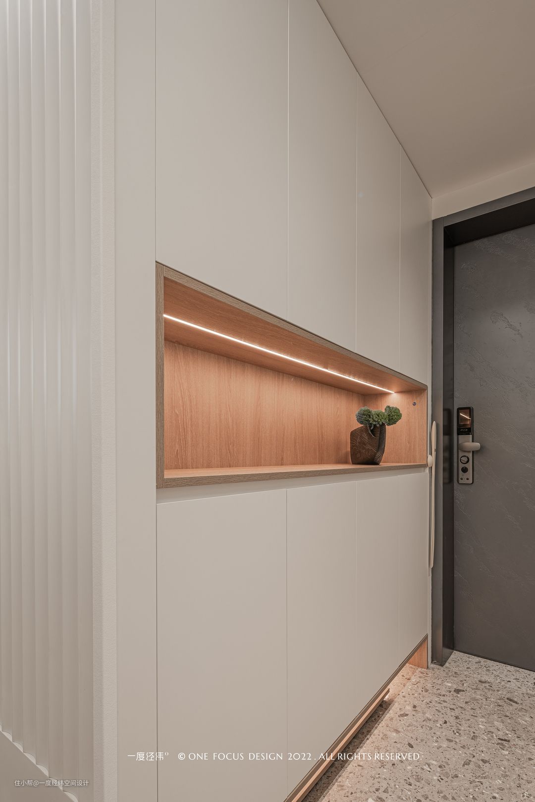 在玄关处连接墙体设置到顶鞋柜,柜子与墙体平齐,中间的开放格和底部摆放日常更换的鞋物以及绿植。下面预留位置放置更换拖鞋,预留灯带以免磕碰。
