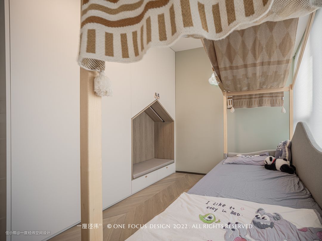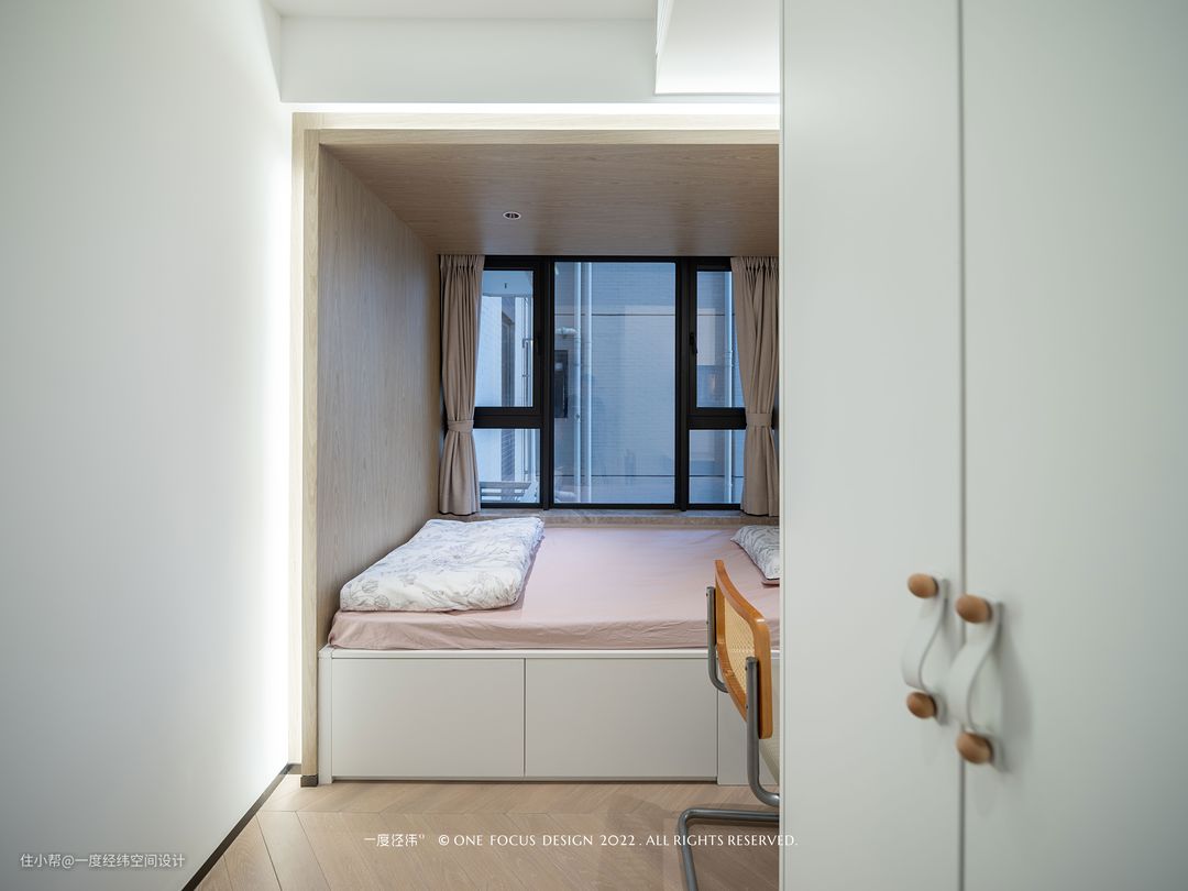 保姆房利用飘台进深结合榻榻米形成1.2米宽的床,满足收纳的同时也有足够的的休憩活动空间。