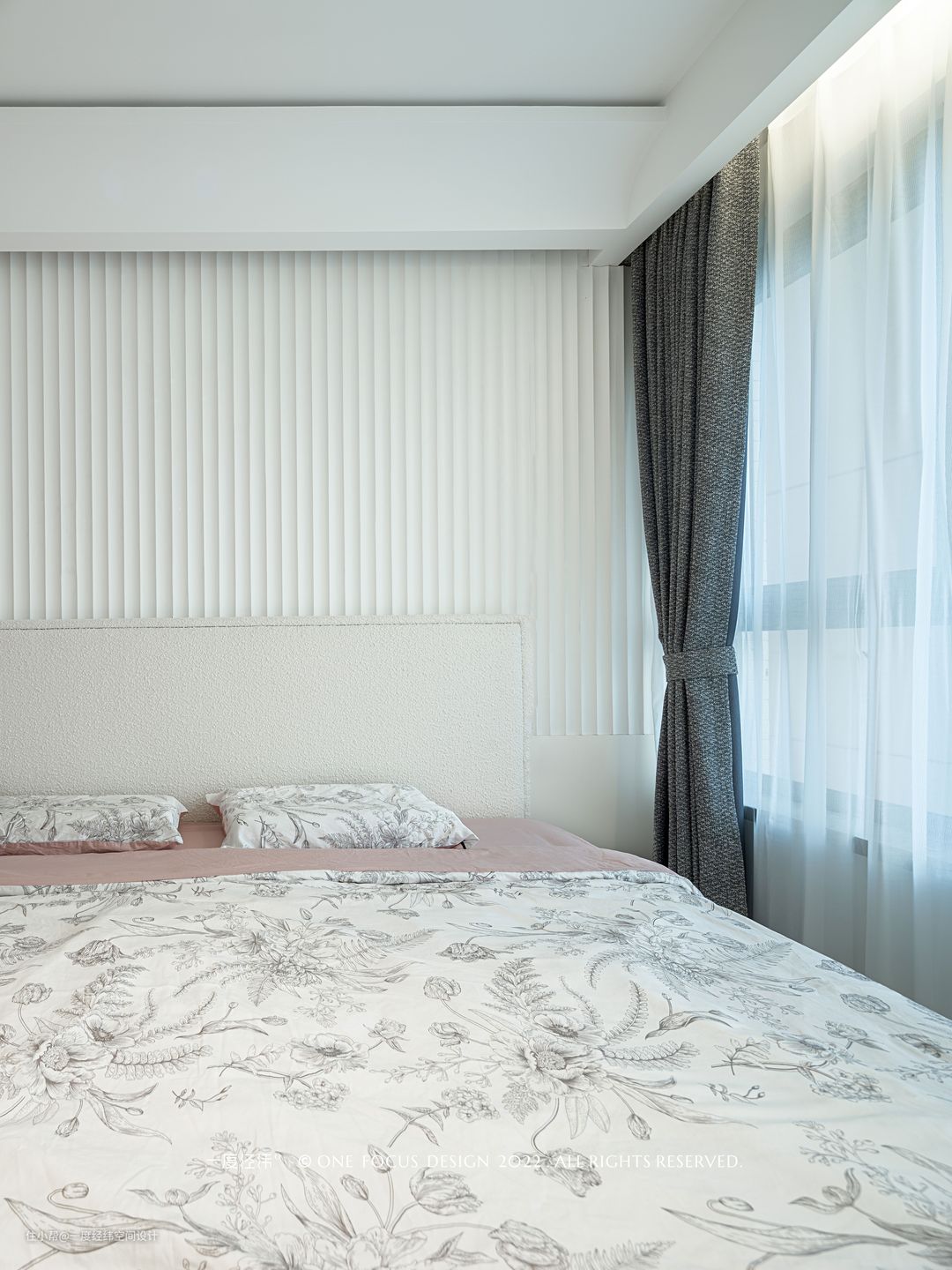 主卧延续使用白色乳胶漆与白色烤漆板等材质,床头背景采用3835mm*1750mm的白色格栅造型护墙板,用黑色不锈钢做踢脚线。
