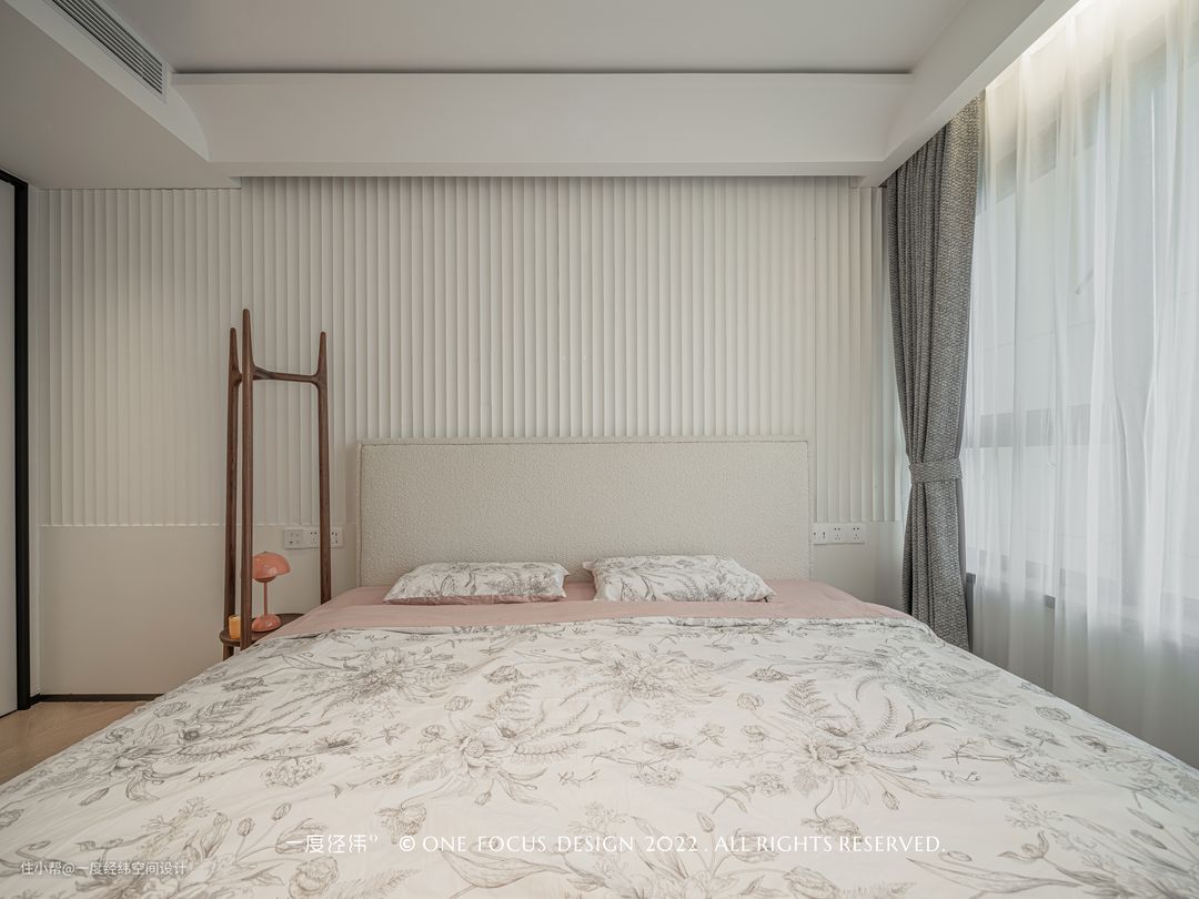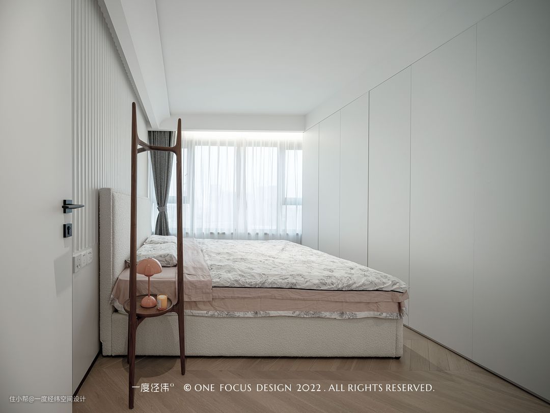 主卧的设计以白色与原木色为主,现代简约的风格,干净利落。大体量衣柜与墙体融为一体,更大程度地放大了主卧空间。