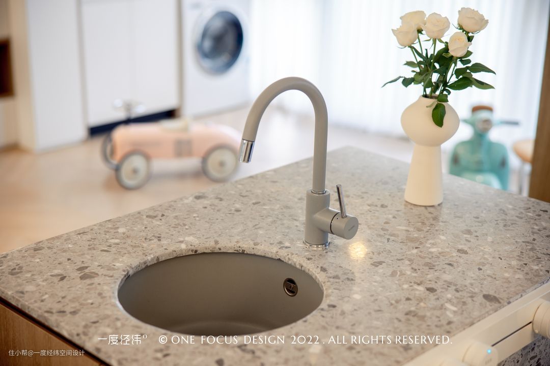 餐厅岛台同样满足餐饮用品的收纳,洗手盘与有轨排插的设计更便于日常制作简餐的使用。