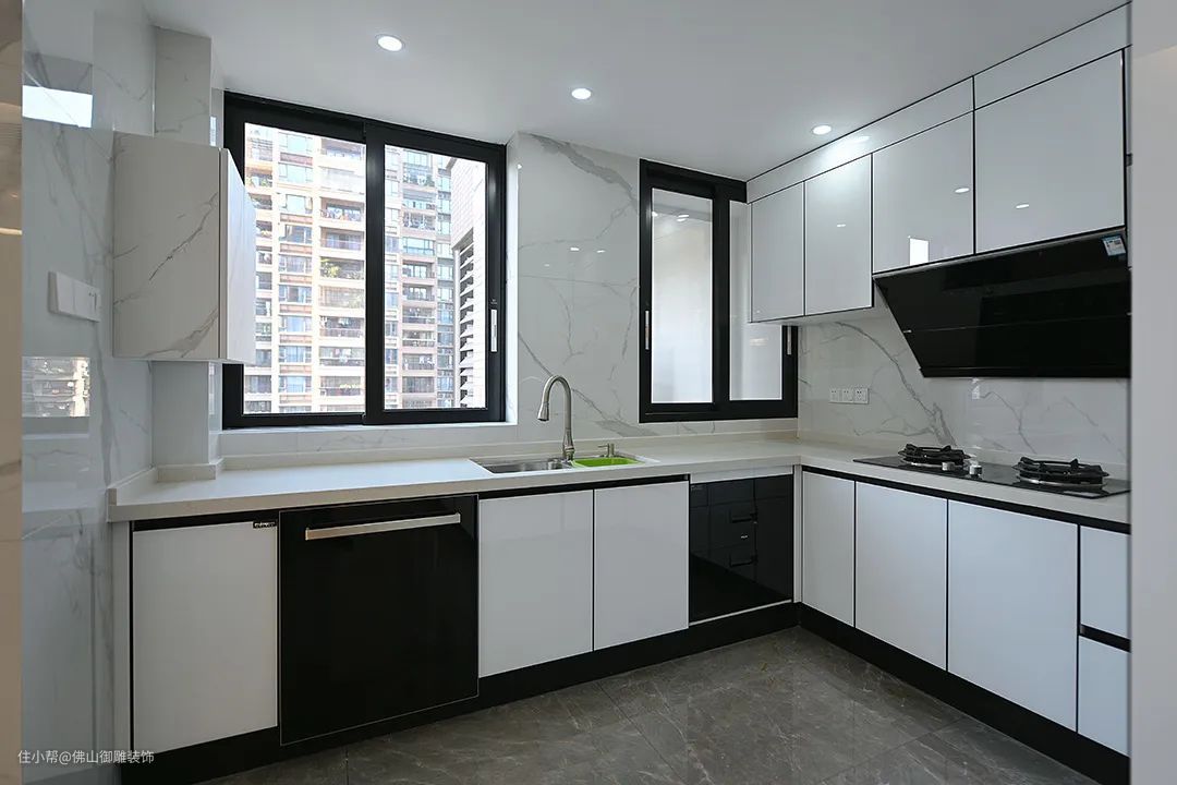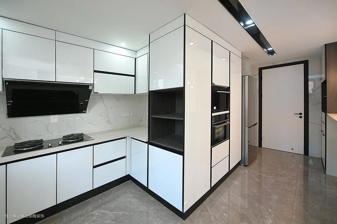为了增加厨房的使用面积和采光,我们拆除了生活阳台与厨房的墙体,并将台面设计为L型,留出冰箱位置,使边角小空间也得到了合理的利用。台面上下都做了收纳柜,柜门选用白色进行搭配,温馨时尚又大气。