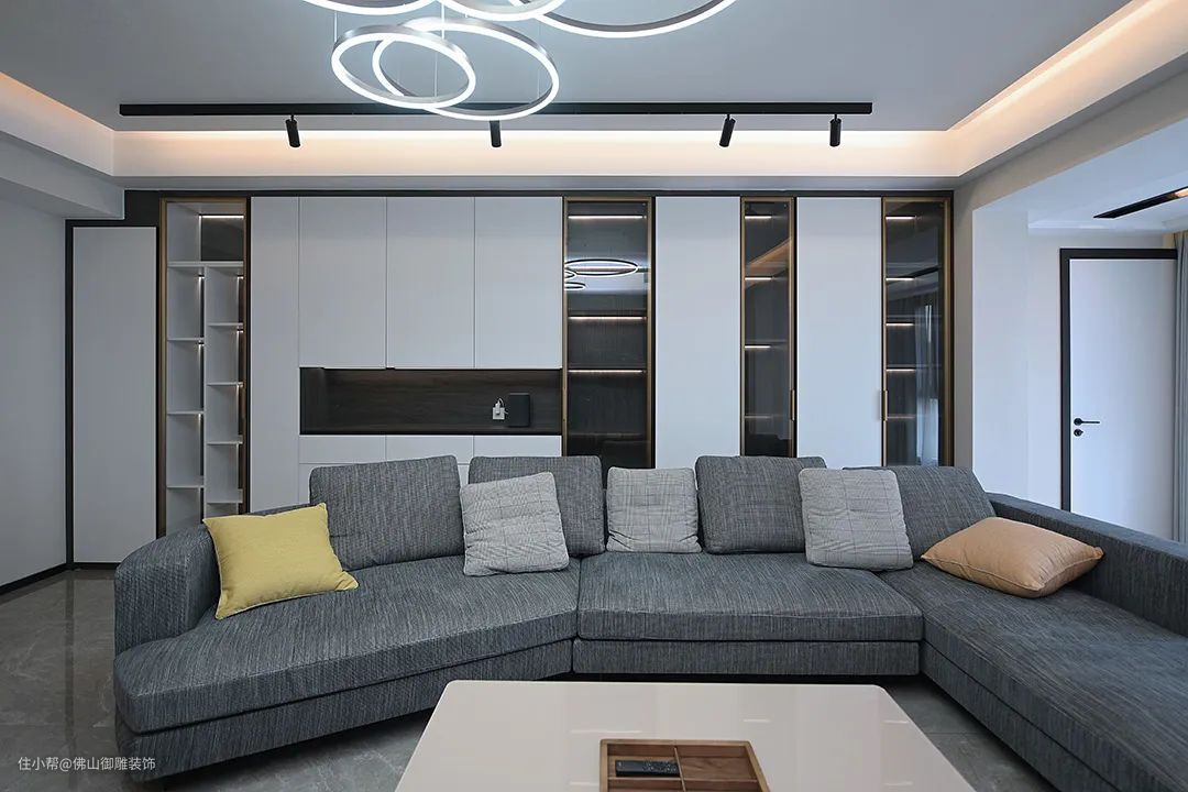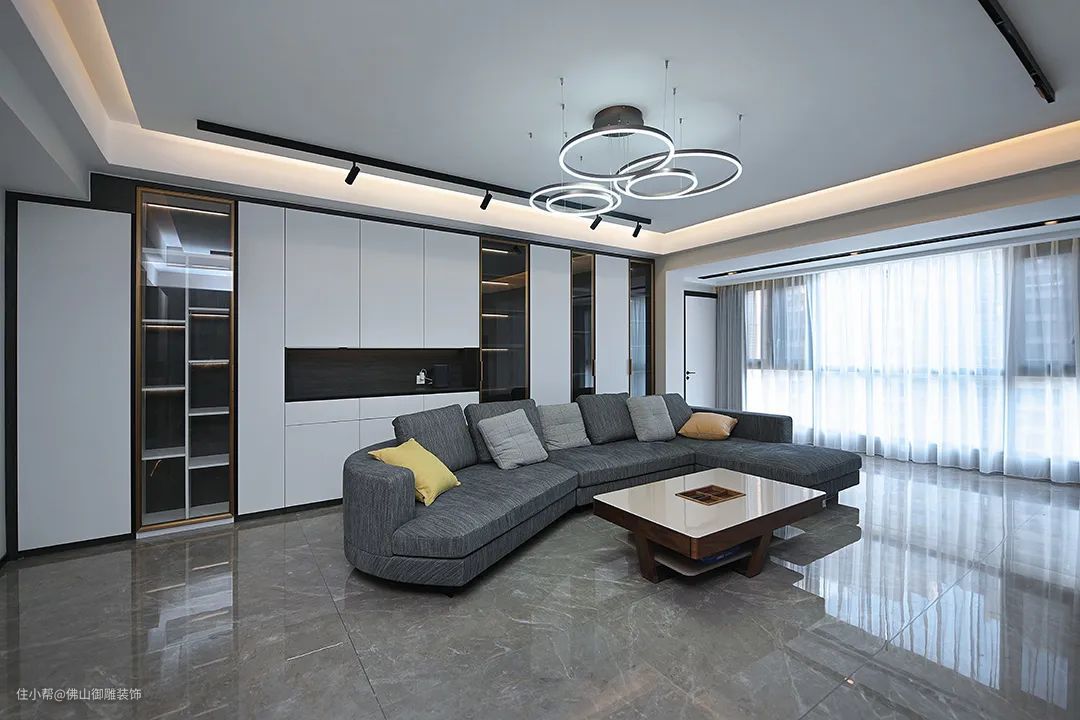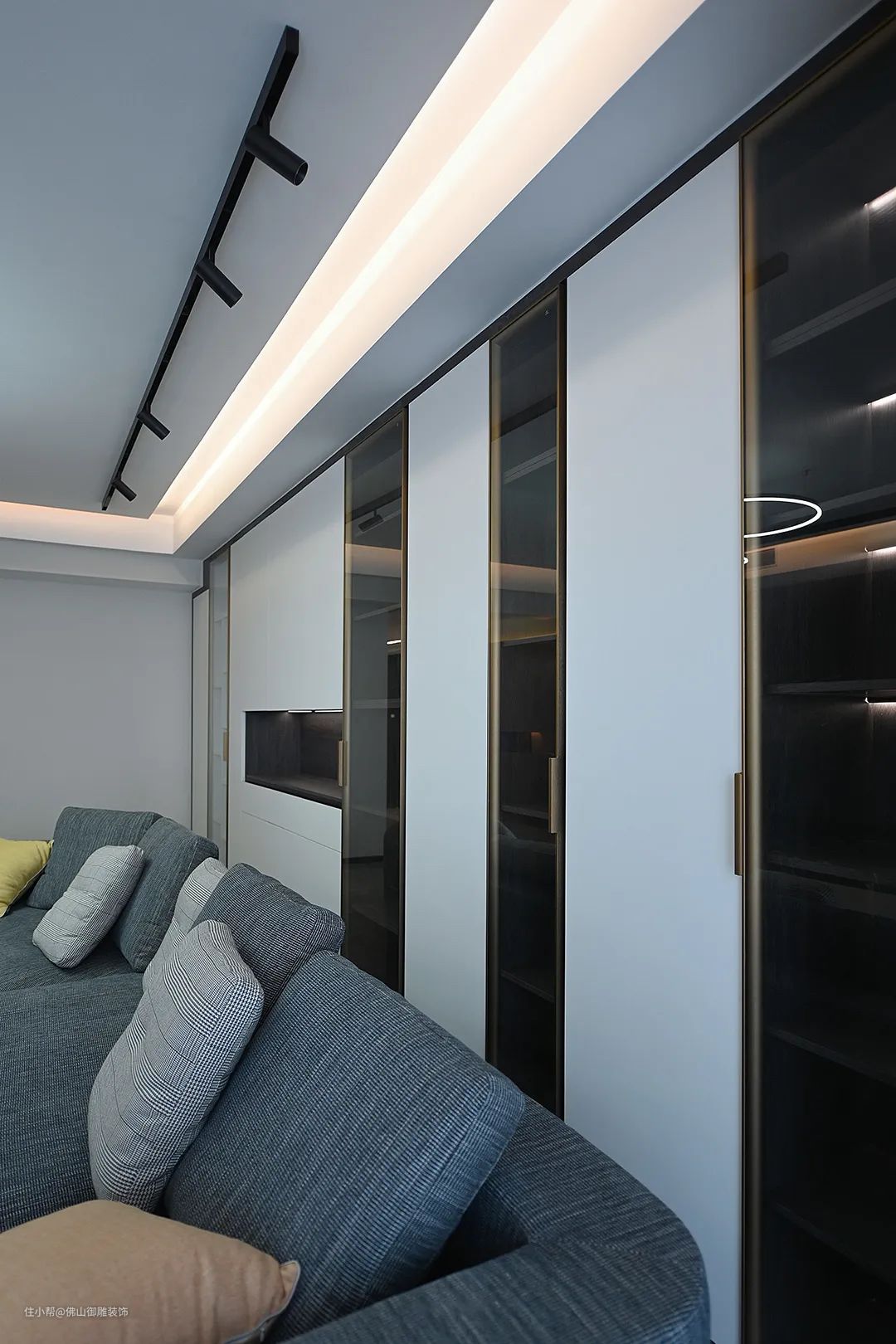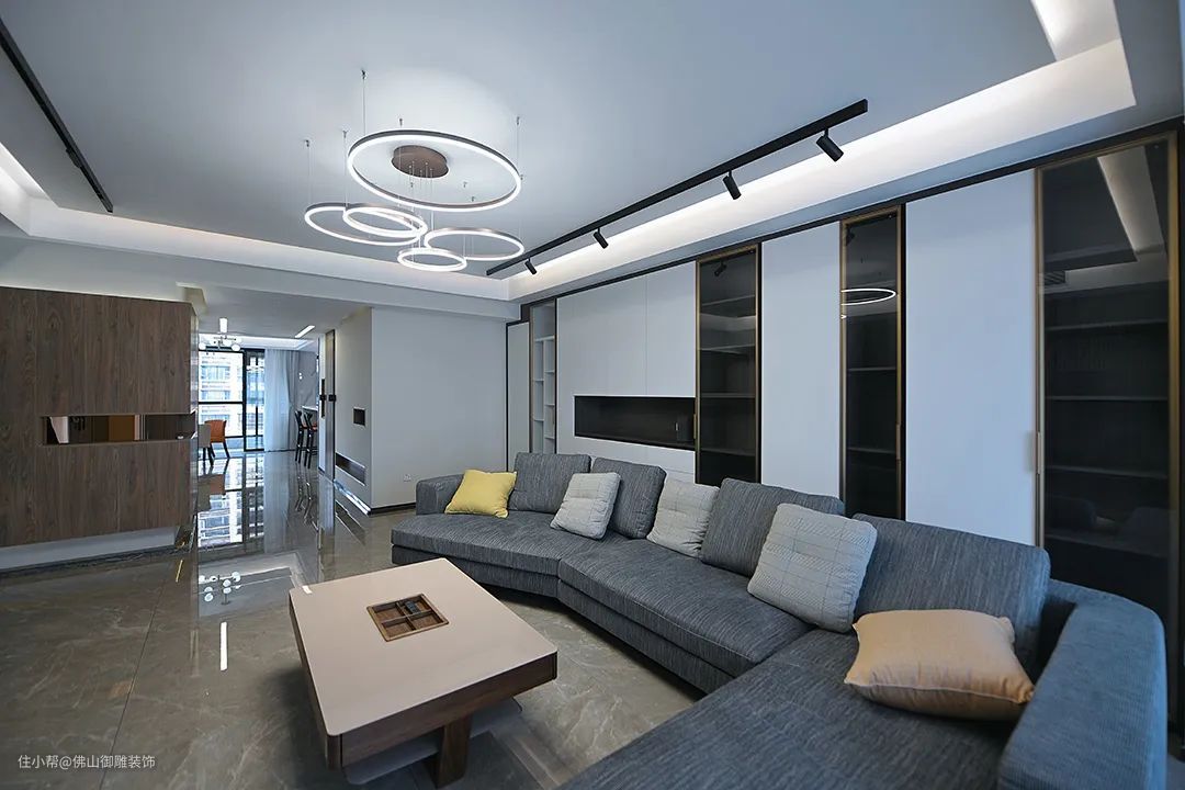 电视墙是灰色大理石墙面叠加木饰面,顺延梁位延展的造型令空间延伸感十足,再加上磁吸轨道灯的运用,扩大了整个公共区域的视觉感,大平层的即视感直逼100分!