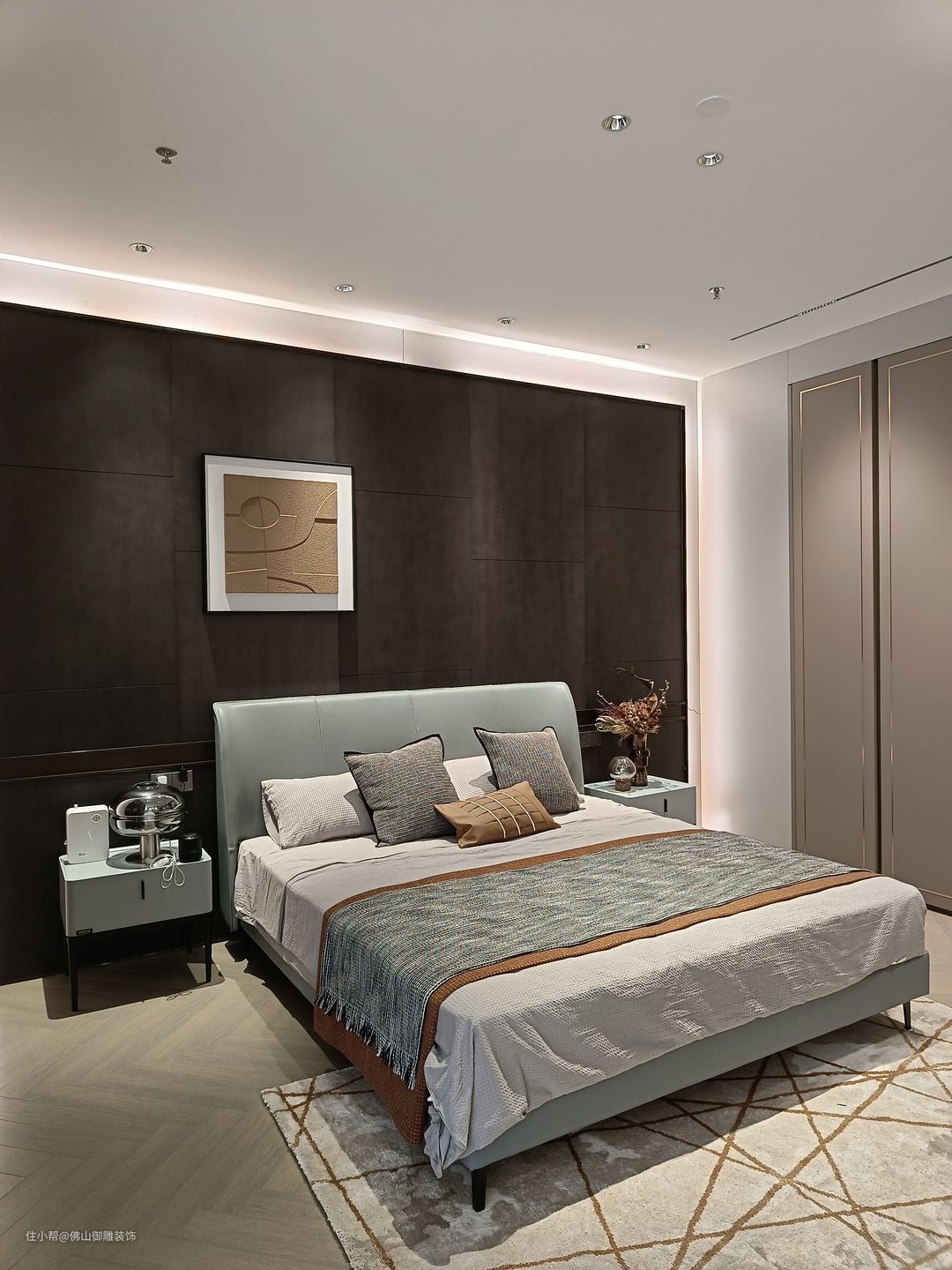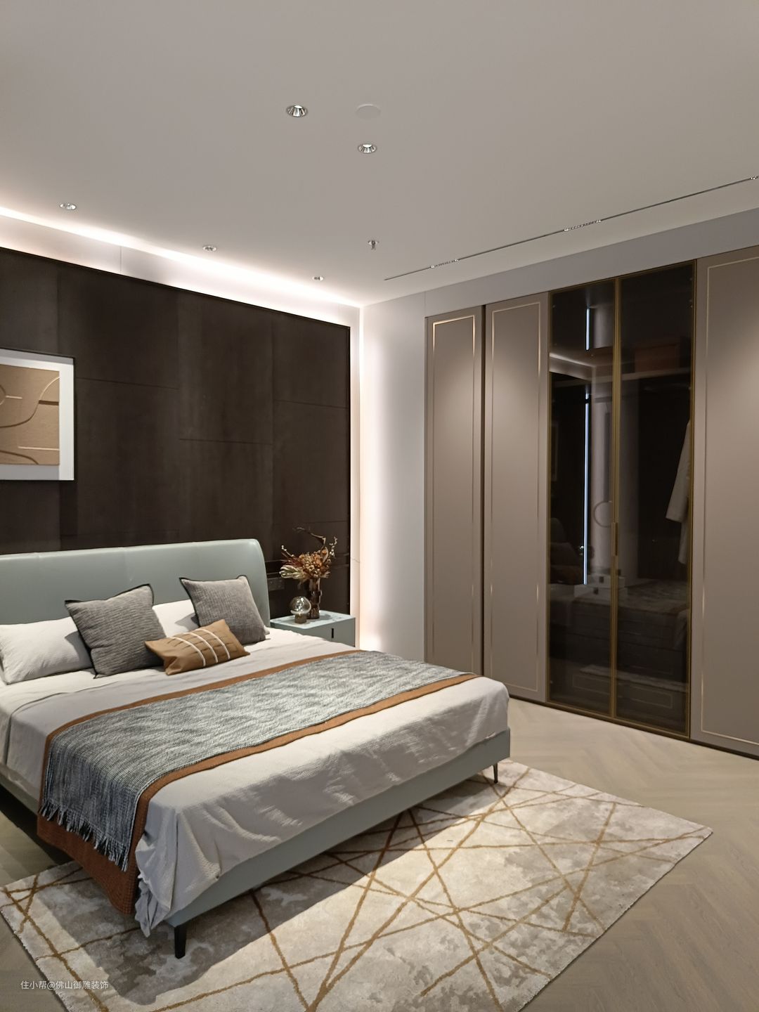 温馨自然、整齐有序,是屋主喜欢的睡眠环境,设计师在主卧的打造上,选择了暖咖色+灰色烘托主卧柔和温暖的安睡氛围。