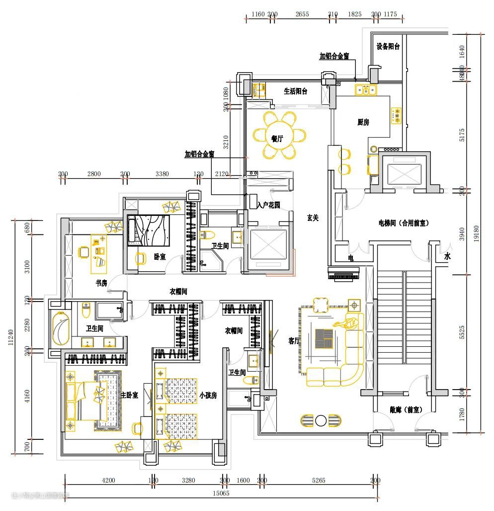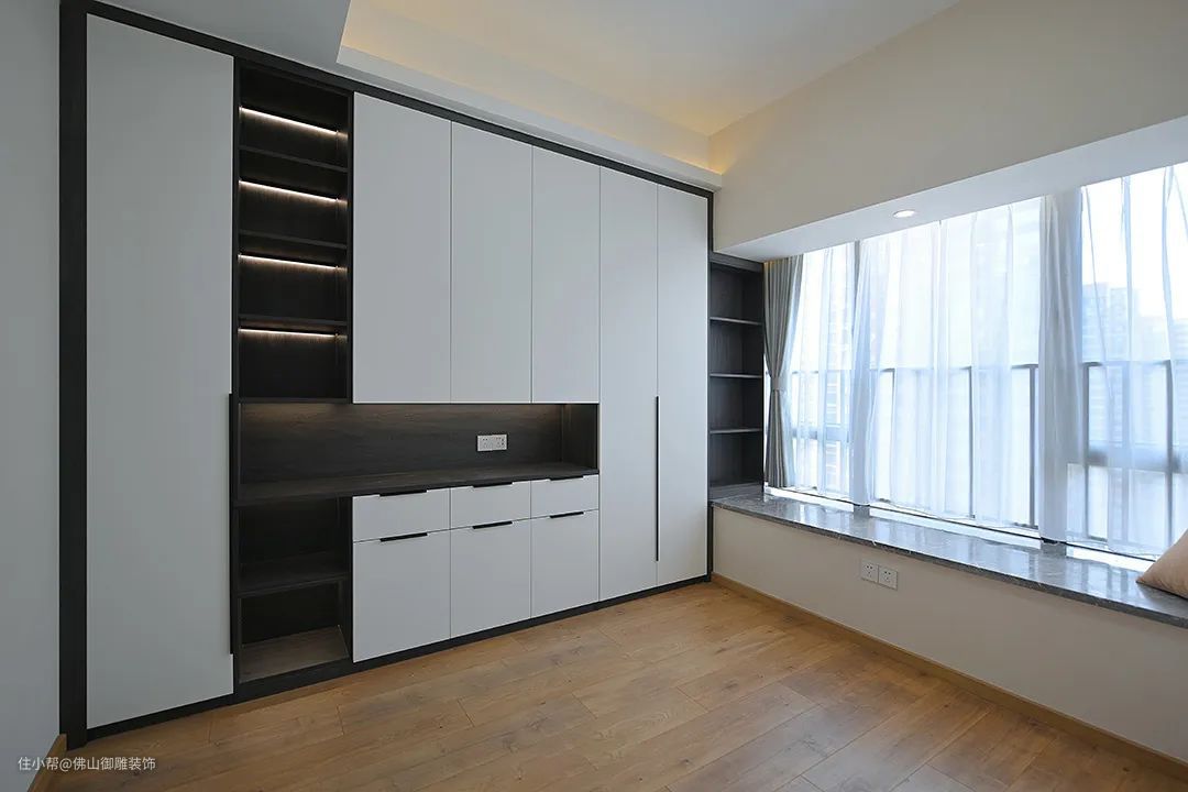 考虑到业主父母住附近,对于卧室的功能需求,除了主卧外,仅需预留未来儿童房即可。因此,将原来中间的房间进行拆改,一部分用作主卧衣帽间,另一部分用来扩充次卧收纳柜,同步升级了两间卧室空间,嘎嘎棒~