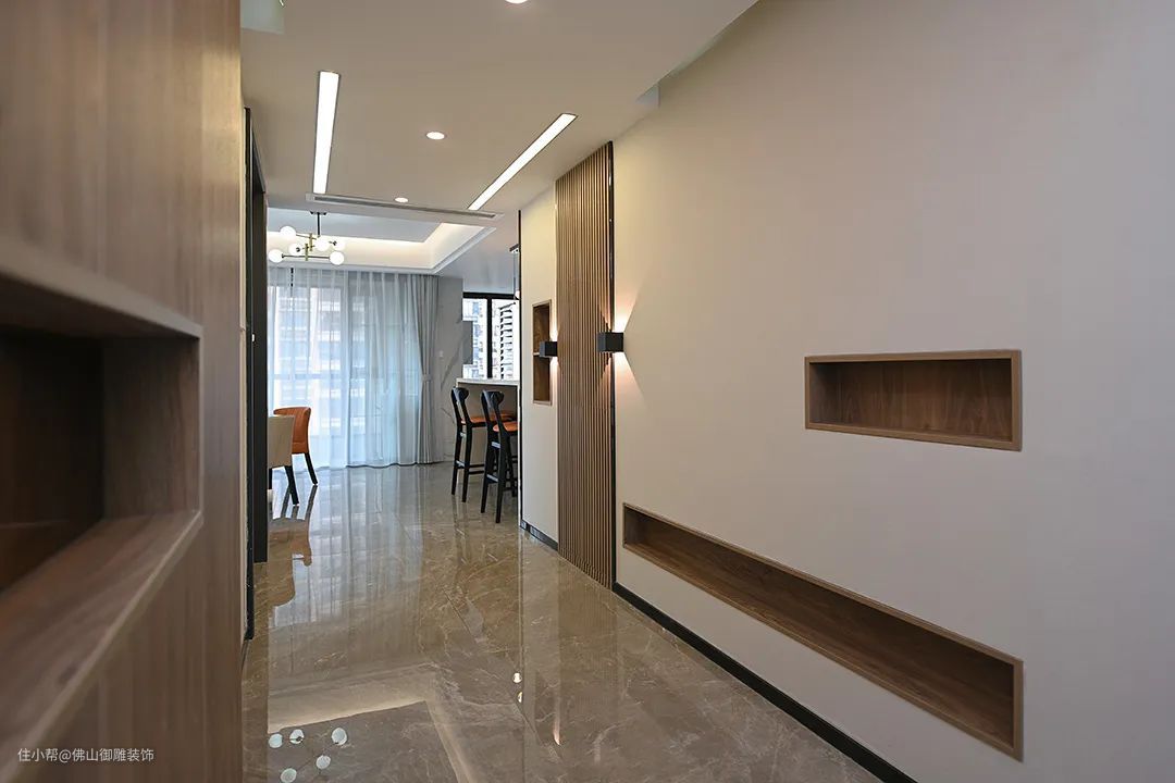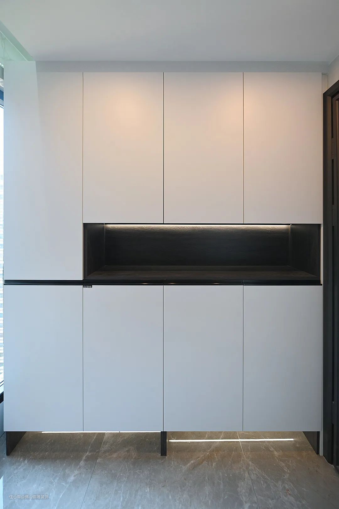 不锈钢+木质的结合提升空间质感,将鞋柜做成上下分体悬浮式造型,后期搭配大理石台面和连接上下柜的开放装饰格,使得鞋柜区域变得不再常规,自带非凡气质。