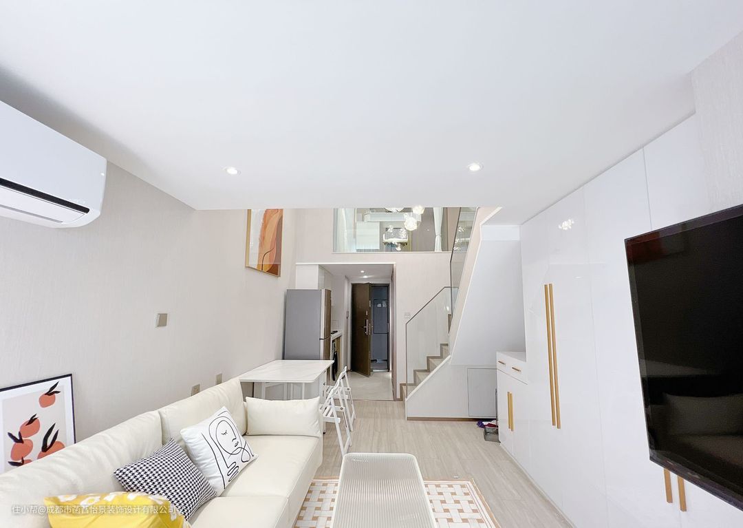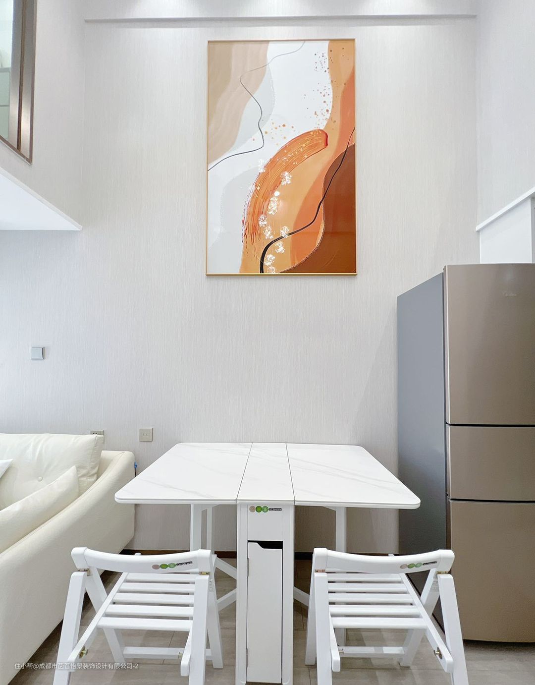 餐厅的区域中,一张简约白的餐桌搭配着顶部的灯光,营造出一个舒适大气的用餐氛围。