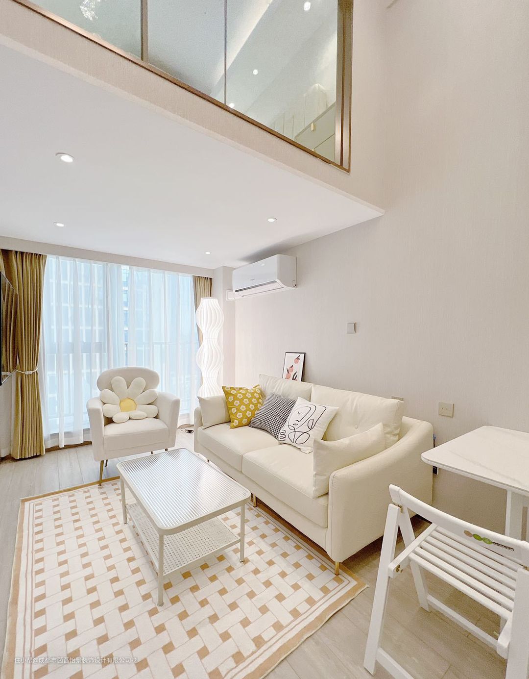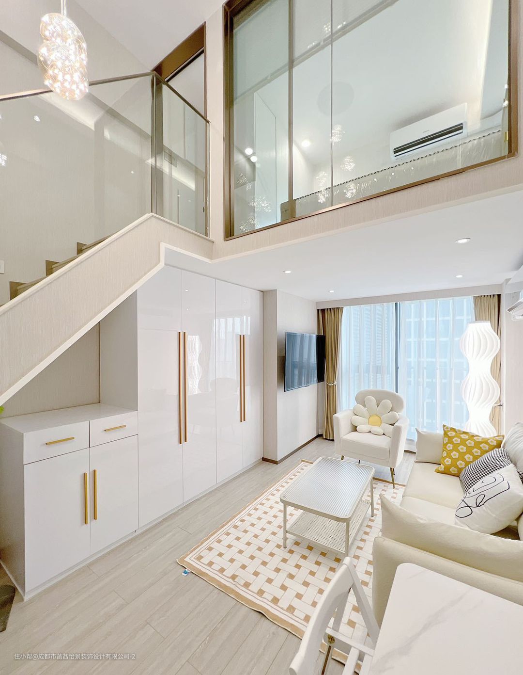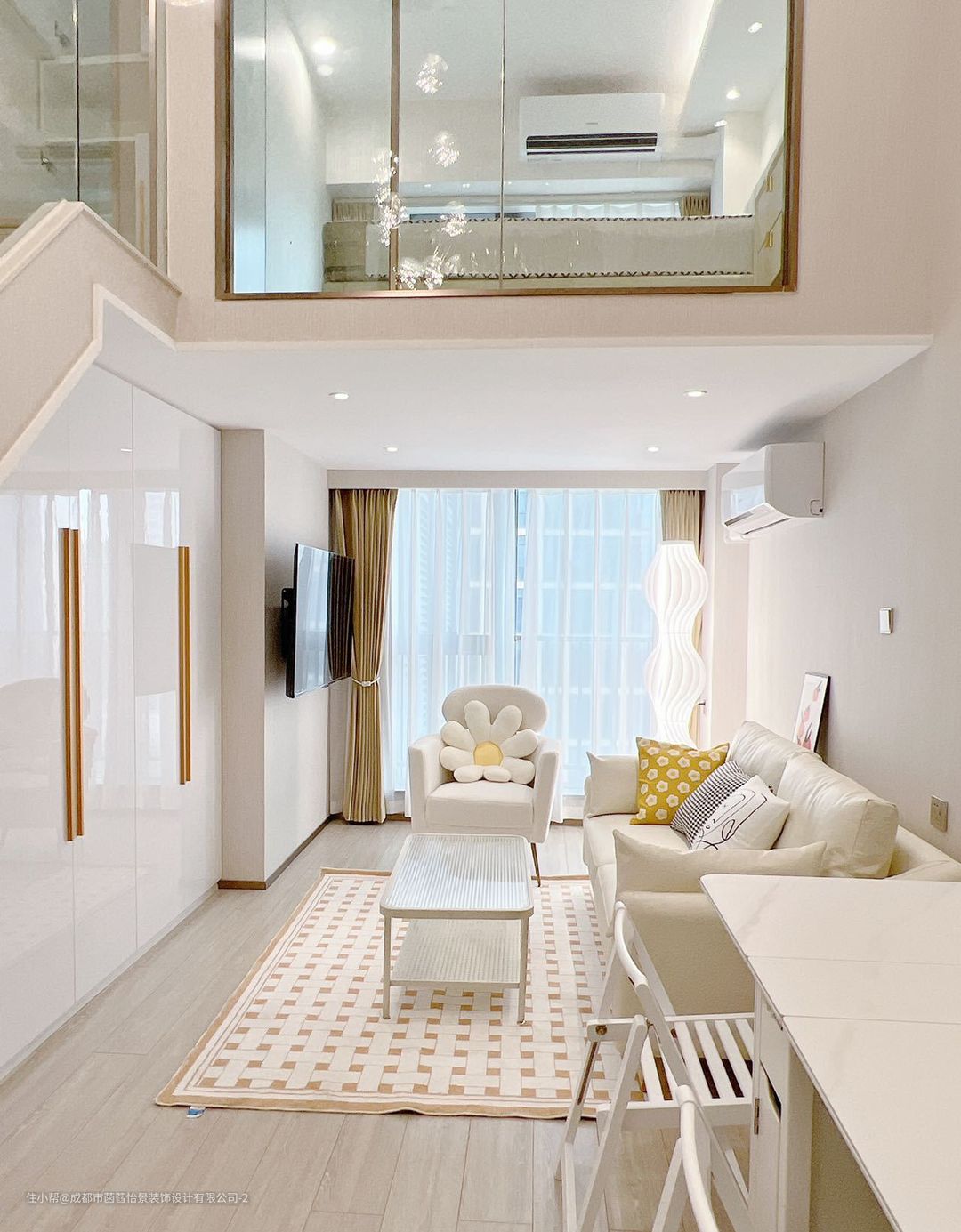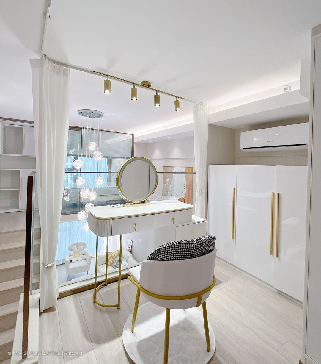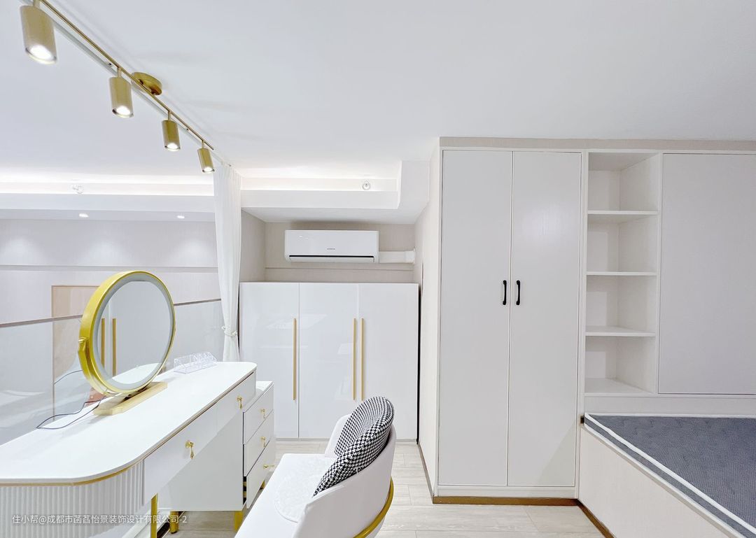 上层的空间分为两部分,定制的柜子增加空间的收纳,在一侧加入梳妆台的设计,增加空间的格调感。定制的榻榻米床,可以满足生活使用的多样性;