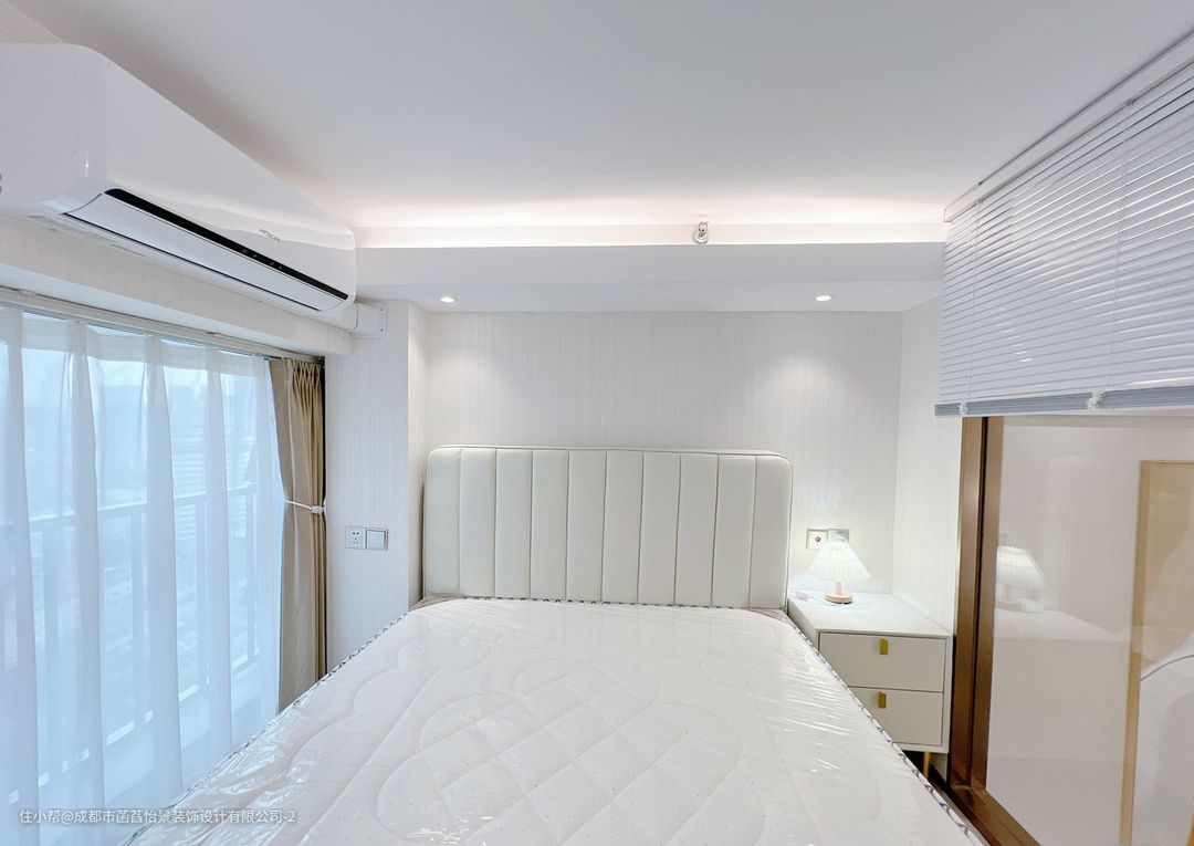 主卧的空间中,一张白色调的双人床,一张大面积的落地窗,为室内带来了充足的采光,暖色调的灯光,带来舒适的空间氛围。