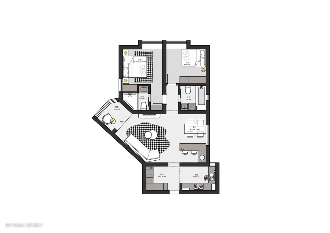 此户型总体来说还不错,客厅有些异形,但是客餐厅面积比较大,我将冰箱设计在门厅区域,增加了厨房的台面,设计了西厨也满足女主人日常一些咖啡西餐的需求,地台的设计让阳台不再鸡肋拥挤,洗烘一体的洗衣机设计在了客卫,卧室都配备了储物柜。