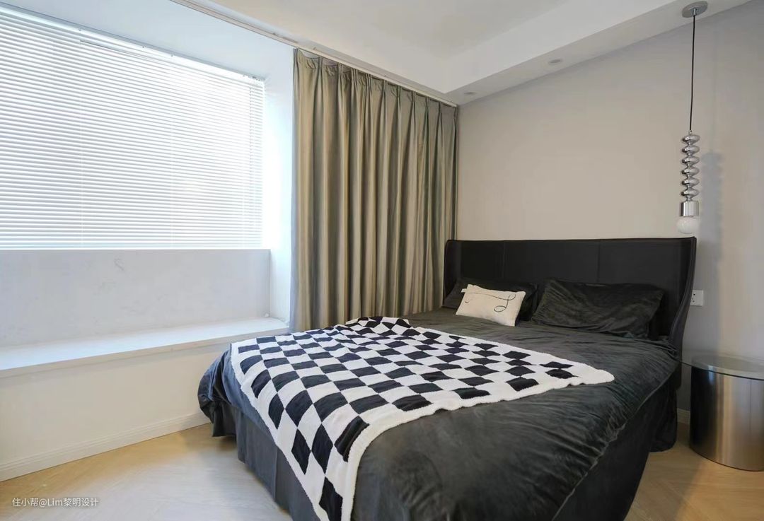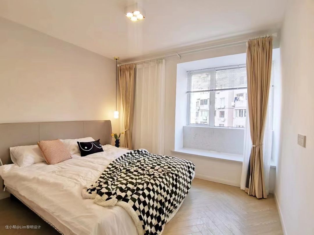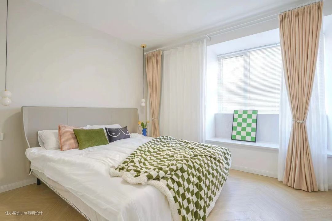 主卧也是无主灯设计,选用温柔的奶茶色窗帘,柔和而静谧。