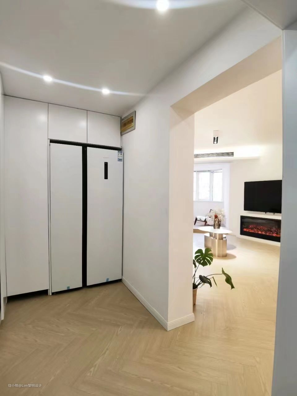 门厅设计了纯白的储物柜,与白色墙面一样提亮了整个入户空间,冰箱内嵌其中,地板通铺到客厅,空间更加通透。