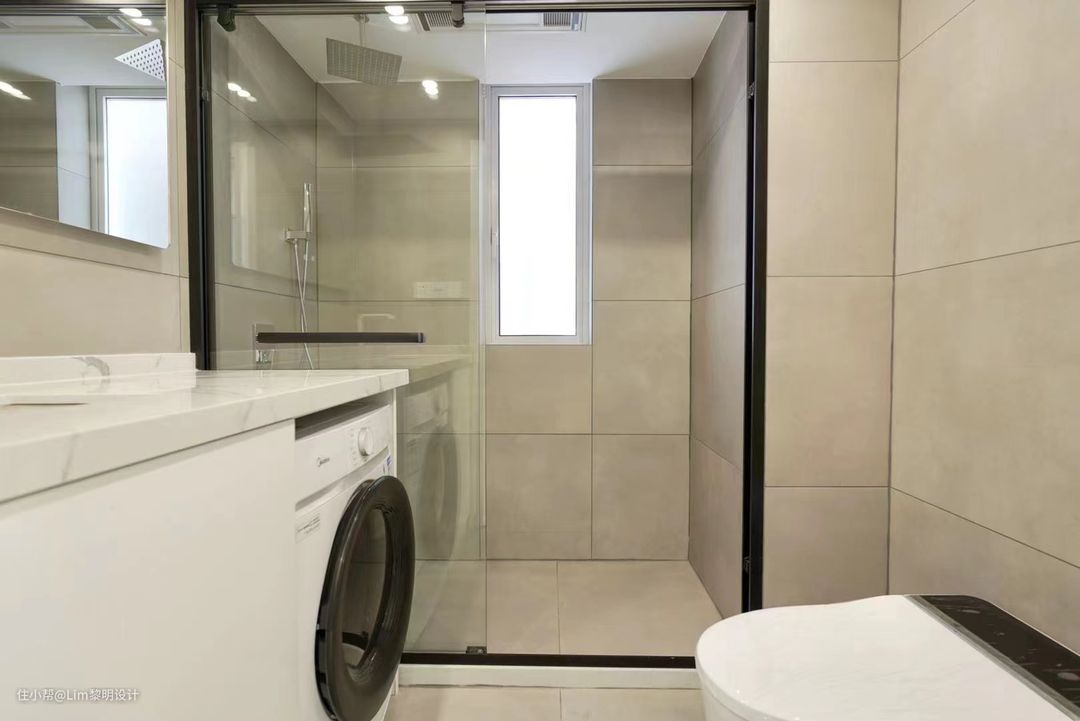 卫生间设计了耐水石膏板吊顶,墙体地一体的灰色哑光大砖设计让空间更加简约大气。