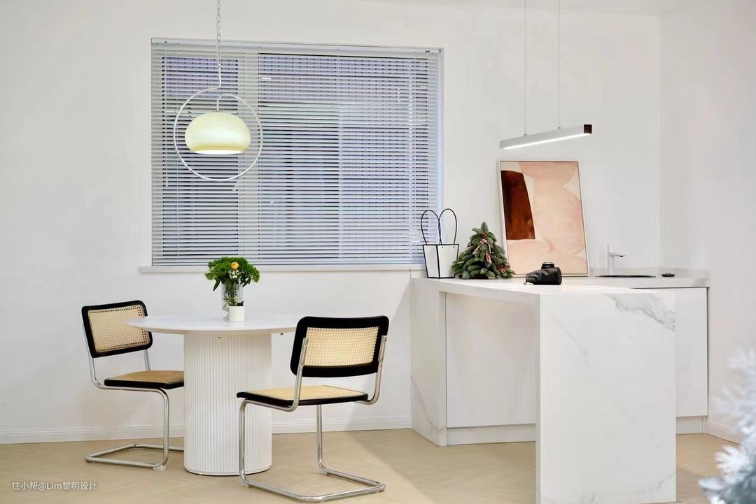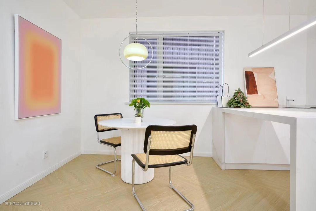屋主不常在家吃饭,因此餐桌选用了圆形的双人餐桌即可满足日常所需,日落余晖的挂画给纯白的空间增添了份色彩。