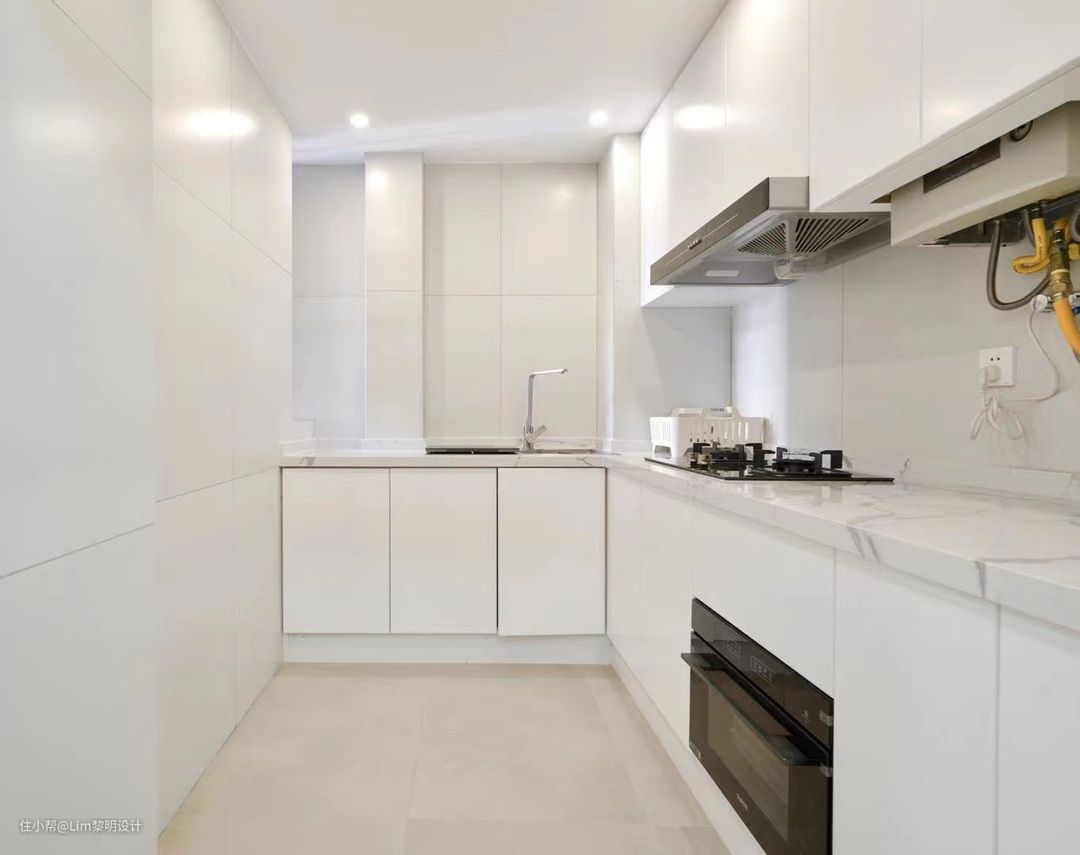 纯白的哑光砖配上白色的橱柜,整个厨房空间看着明亮干净。