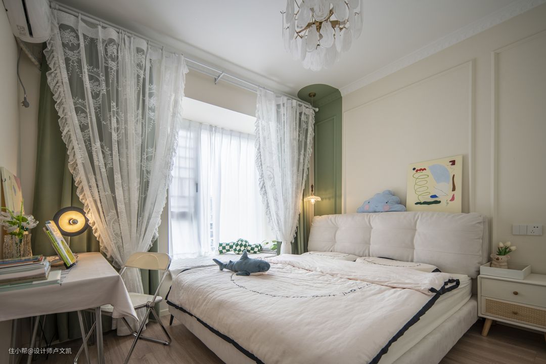 主卧床选择了1.5米无边框软包床,柔软舒适。床头的一抹绿色与窗帘,还有客厅的小花架一样(因为小花架是屋主用剩余的墙面乳胶漆自行涂刷的)