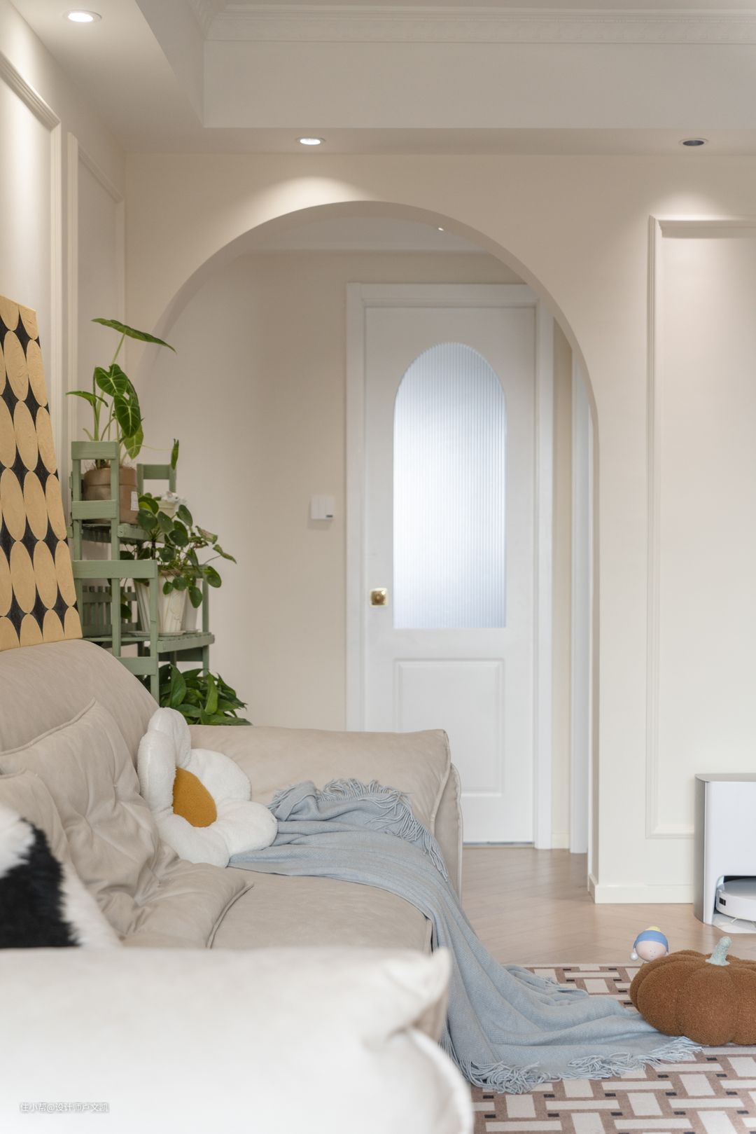 客厅的整体造型简洁大气,墙面的石膏线条简单点缀。 空间过渡位置门洞采用弧形门洞的做法,节约了门套线,使得过渡自然圆润。 空间色调轻盈,软装搭配上都以鲜明柔和的色彩布置。绿植的错落摆放显得更有生气,郁郁葱葱。