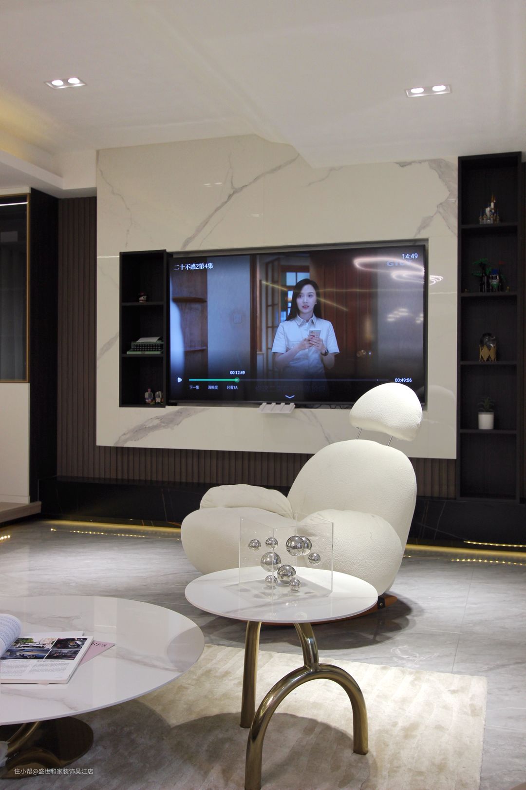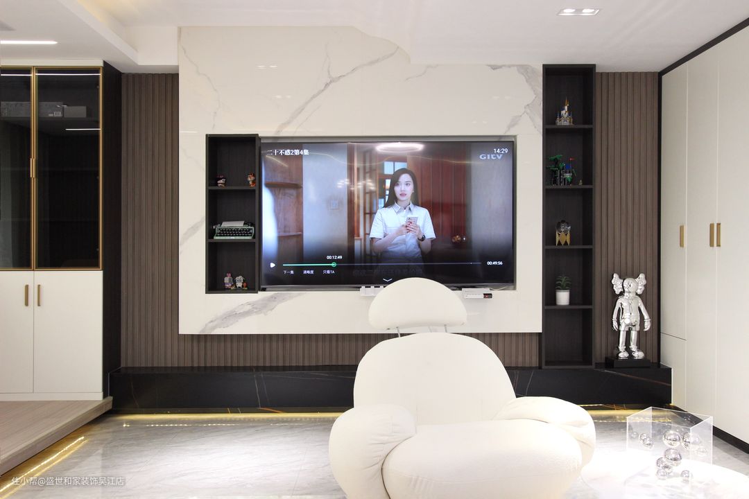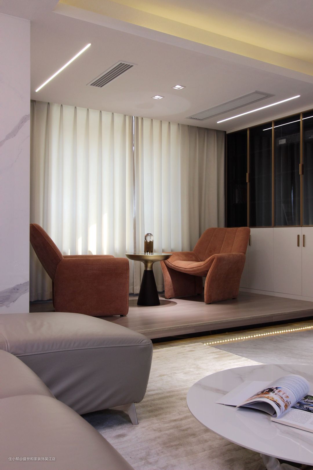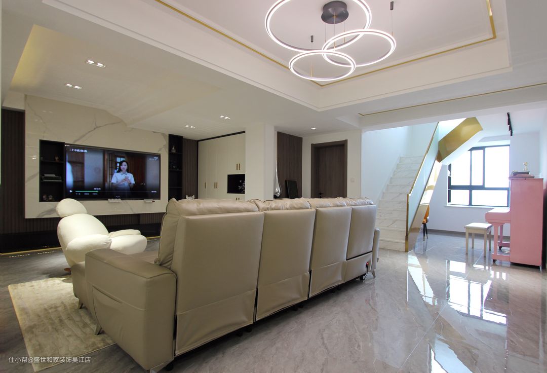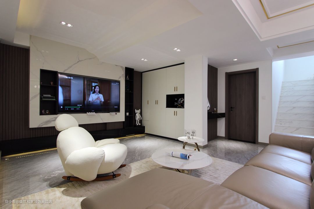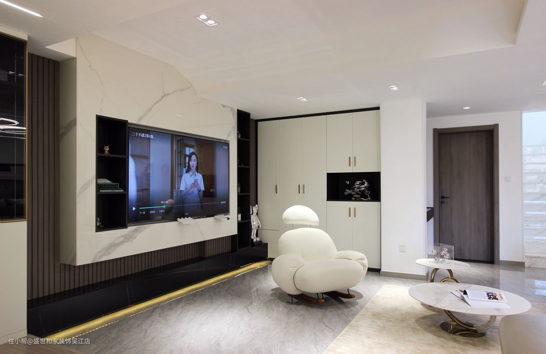 客厅左侧抬高地台做休闲区,上方内嵌灯带可以起到辅助照明的作用。从远处看地台会营造出“悬浮”的效果,让空间兼具层次感和设计感。