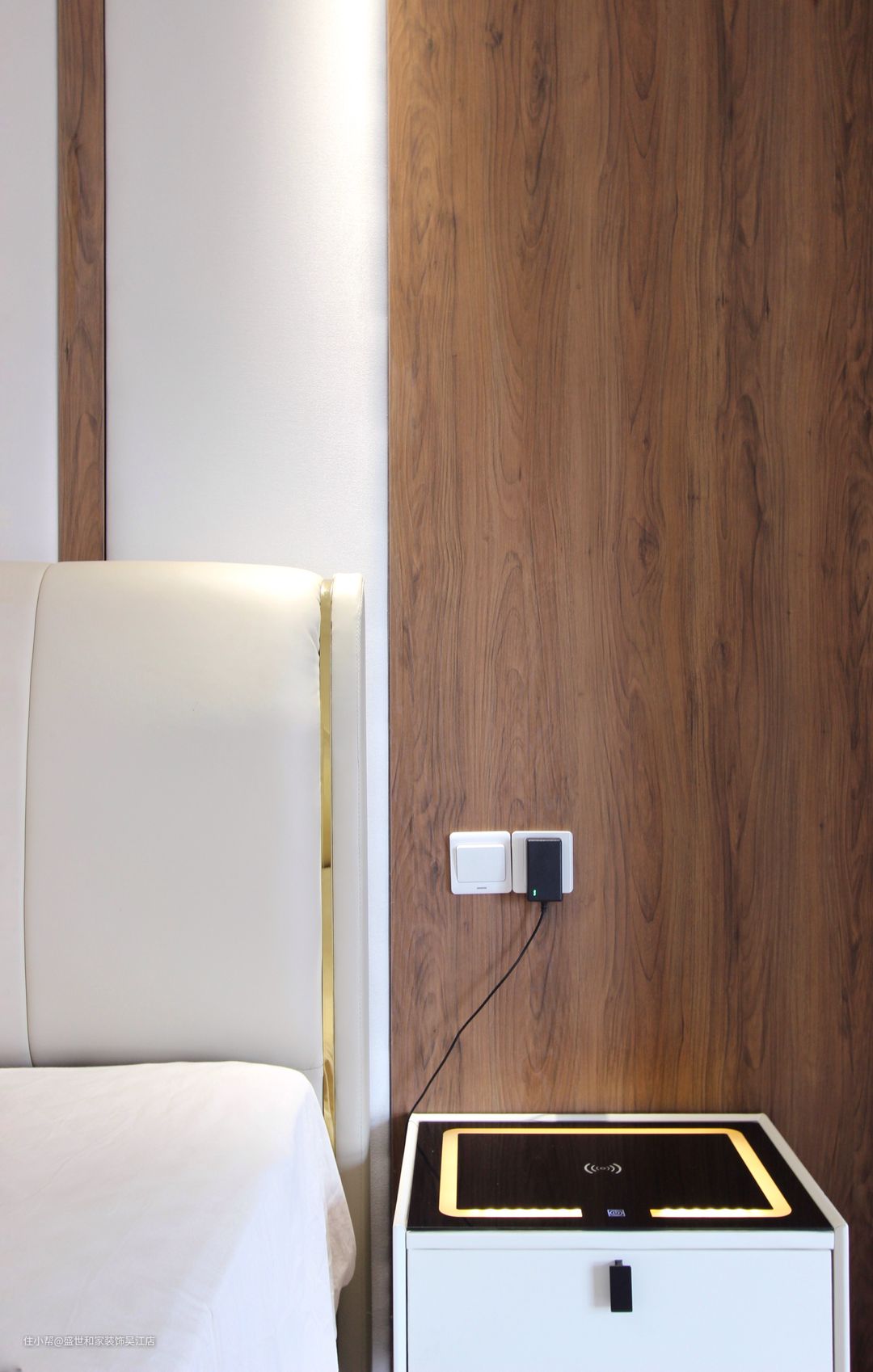 选用智能床头柜,台面是耐摩擦、易清洗的钢化黑玻璃材质,触控式的开关,手机直接放在台面就可以无线充电了,科技感满满。