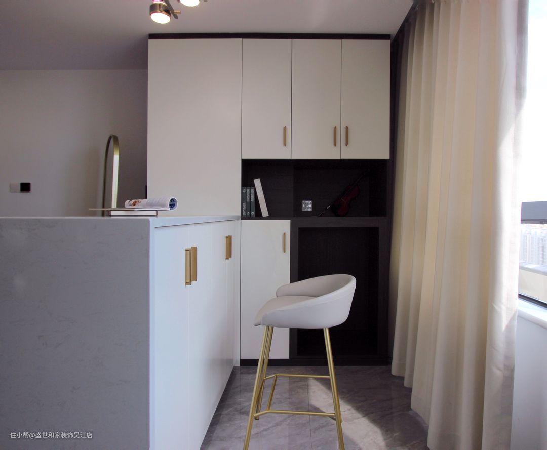 局部镂空设计,可以摆放书籍、装饰物等。吧台两边都放置高脚椅,闲暇的时光,可以在这里喝喝咖啡、聊聊生活。
