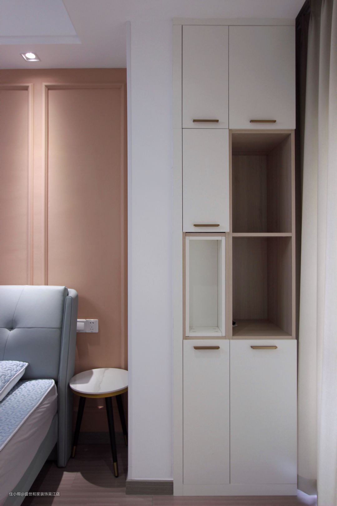 女儿房阳台纳入室内,增加使用面积。同时在一侧设计内嵌式柜体,开放格与封闭式的结合,形成虚实结合的效果,不仅使用更加灵活,也能提高空间的精致度和设计感。