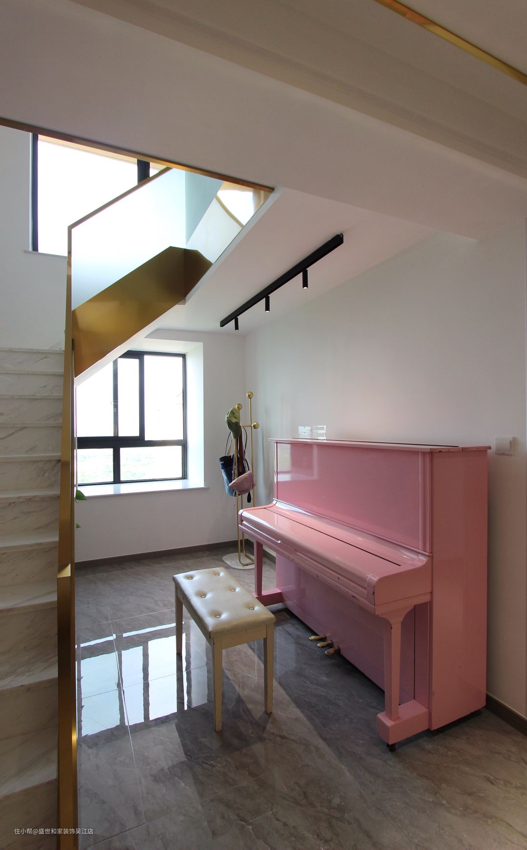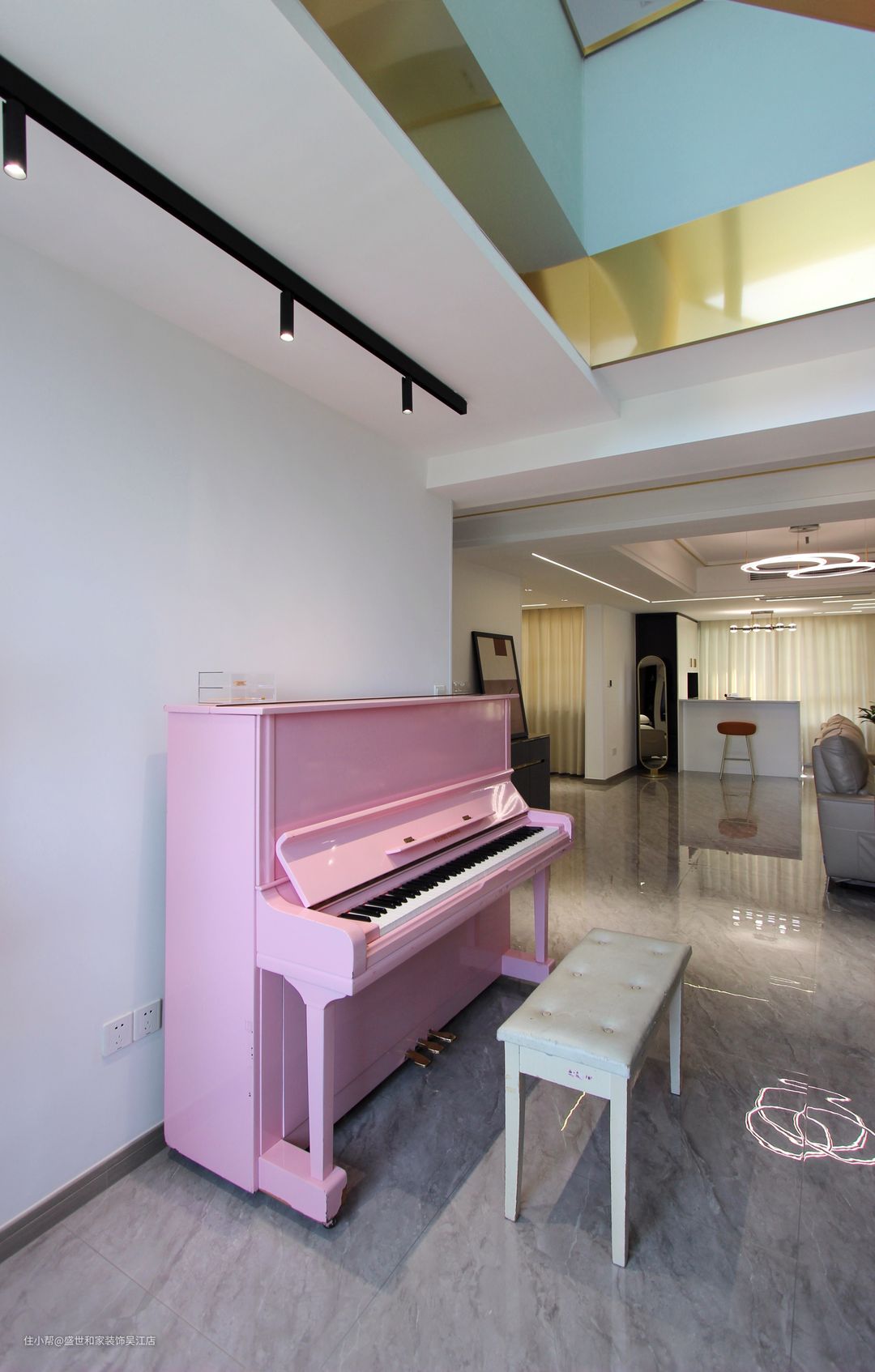 粉色钢琴形成了家里的一道风景线,装饰了空间,客人进来后就被吸引住了,上方三个小光束照亮了它的美丽。