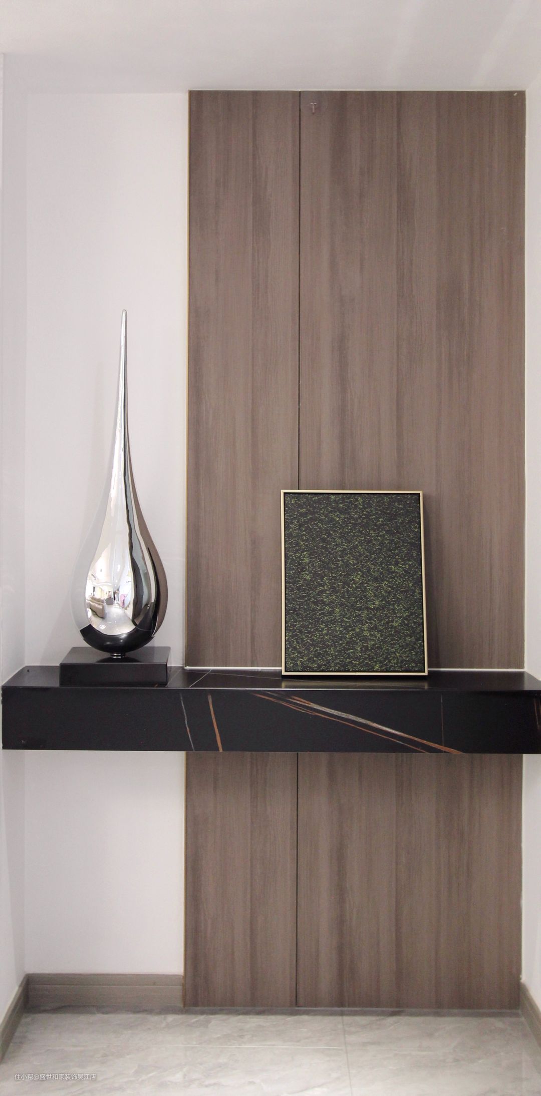 过道尽头一半空间采用木栅格将空间进行贯通,却又有着独特的分割作用。另外设计黑色大理石置物台,悬空安装显得极简时尚而高档。