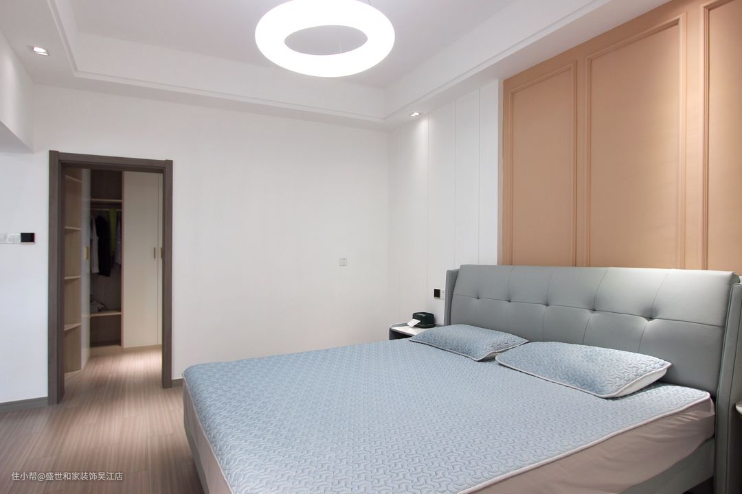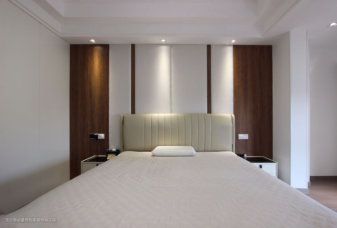 主卧的打造以静谧舒适为主,让居者沉浸在温馨氛围中。顶部筒灯映照在背景墙上,彰显别具一格的空间层次感。