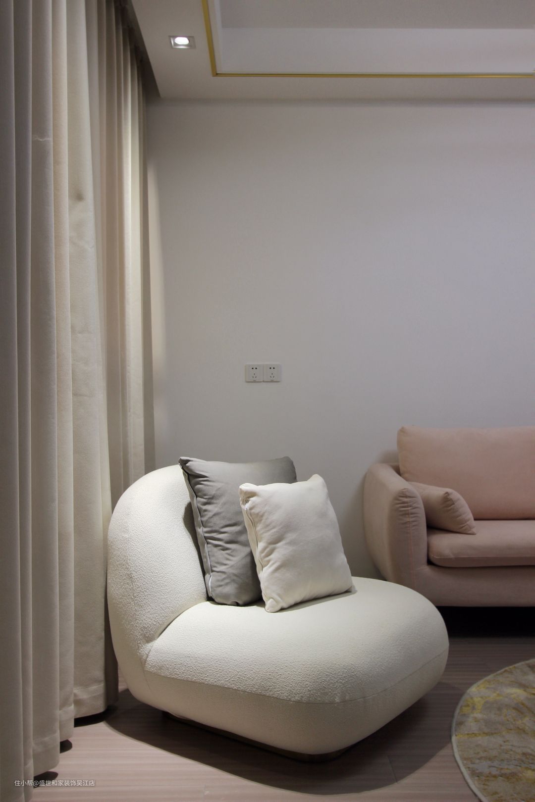 粉色沙发+白色单人椅,冷静而内敛,柔美而活泼。