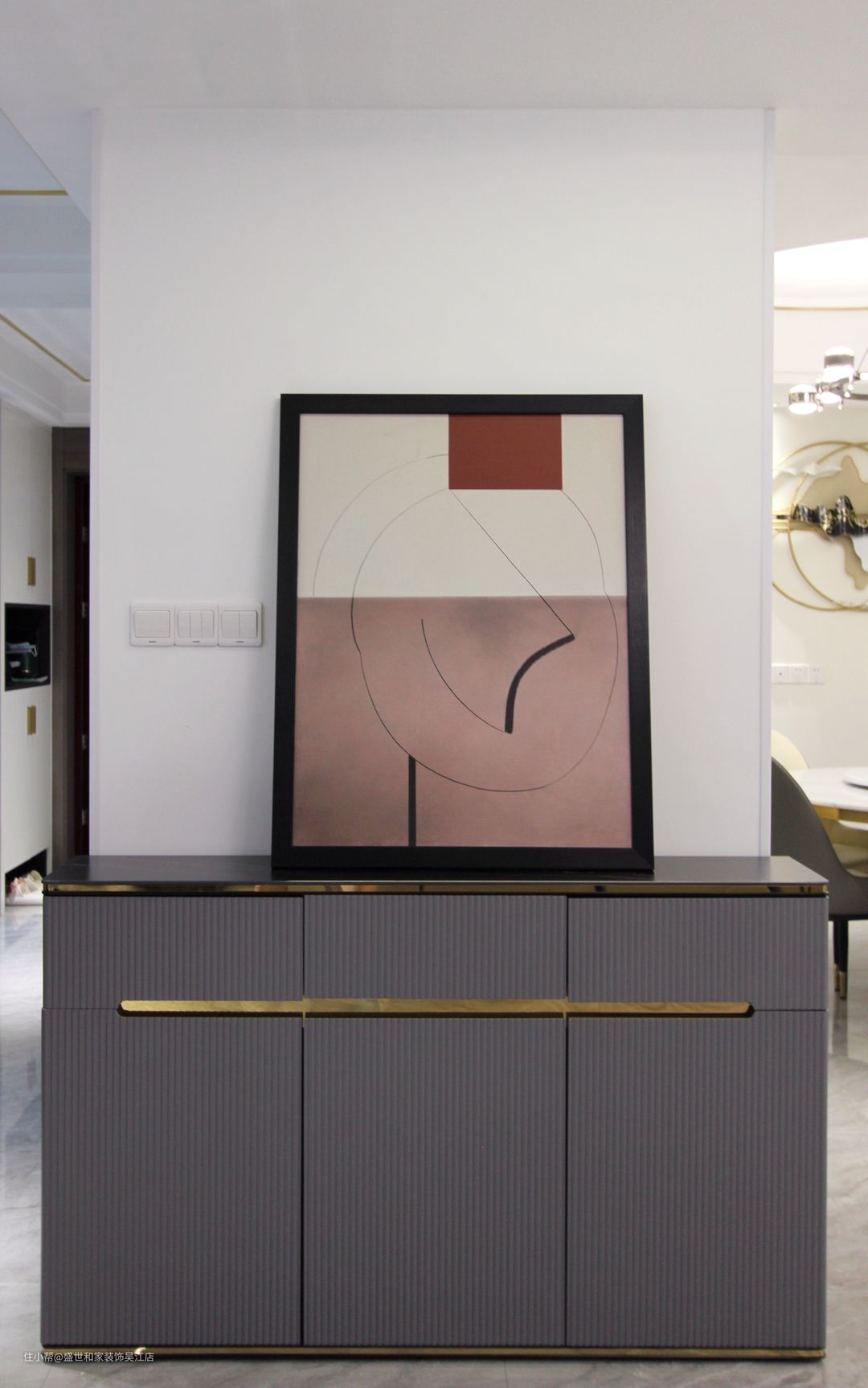 沙发与餐厅之间空余,斗柜收纳兼顾装饰,摆上精致的饰品或者挂画,给空间增加高级感。
