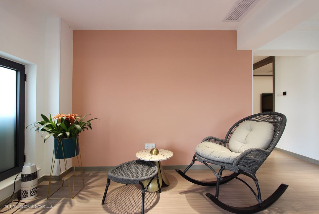 即便是过道这样的空间,也能看出整个设计的用心之处。休闲躺椅、脚凳选用了藤编款式,粉色背景墙让整体看起来温柔大气。