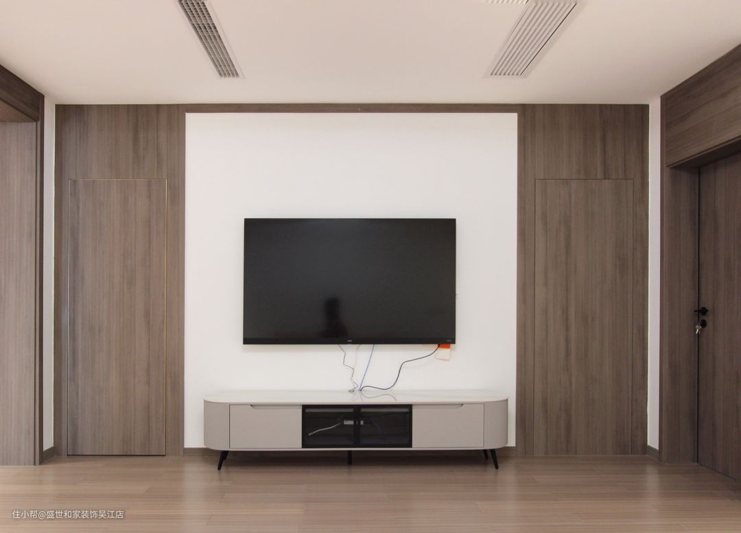 电视背景墙采用了前后、左右的布局方式,后面一层靠近墙面的地方,做了木质格栅造型,用来丰富墙面层次变化。电视背景墙下沿采用了抬高处理,可充当置物台,不为储物只为摆放装饰品。