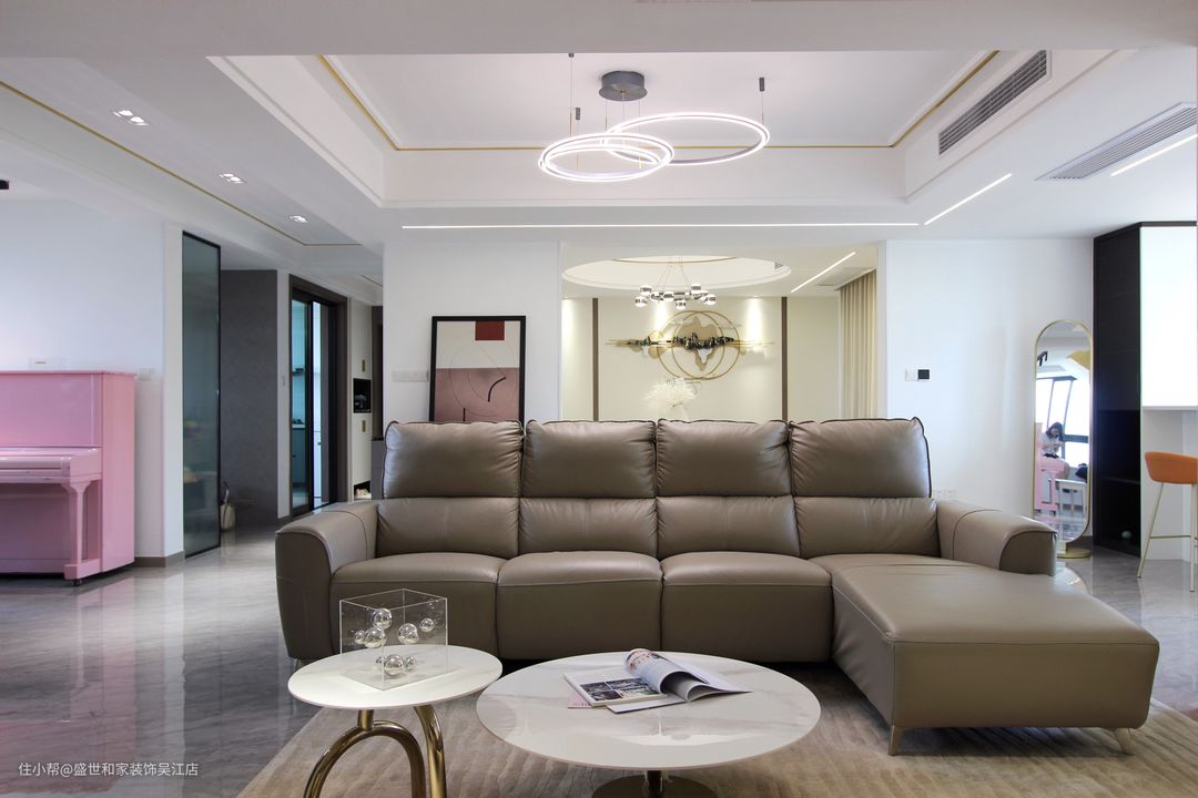 L型的咖色沙发、大理石圆形茶几,既给予了屋主最佳的舒适性,又为空间增添了一抹轻盈的质感。