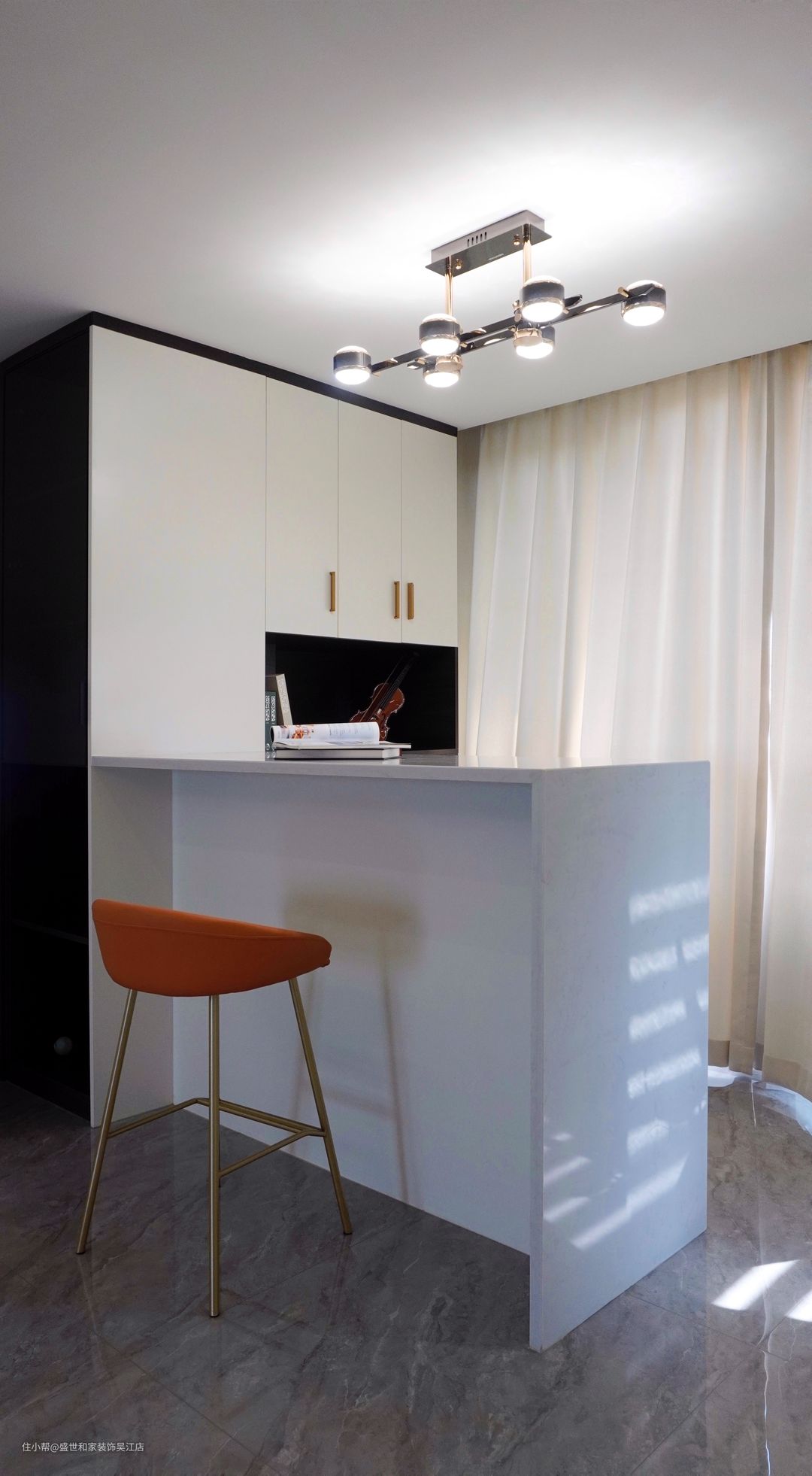 位于落地窗位置是一处自由活动的区域,没有明确的功能界定,为了充分利用空间,设计师专门定制了吧台,可谓一举多得。