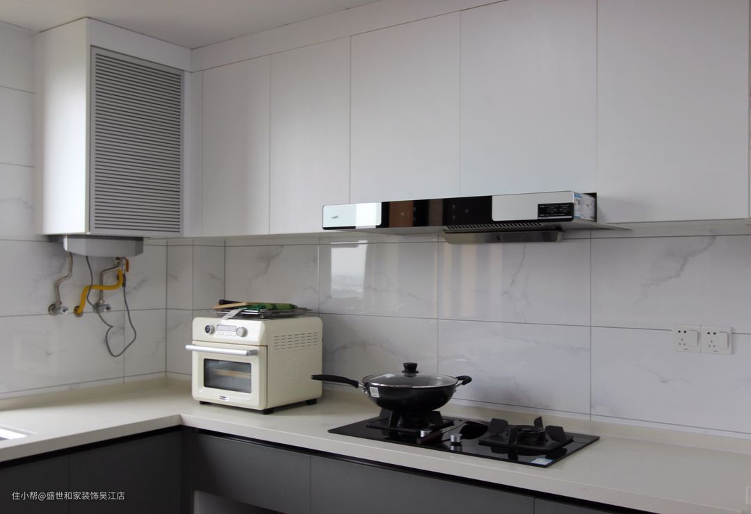 上下橱柜储物空间加倍,分类收纳不同的厨房用品。另外安装开光插座,不用来回插拔,大大的减少了插头和插座的损坏。